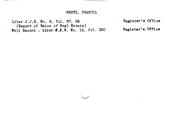 | WENTZ, PHAMJEL Liber J.J.S. No. 8, fol. 57, 58 . Register's Office (Report of Sales of Real Estate) Will Record - Liber 3.&.S. No. 10, fol. 320 Register's Office |