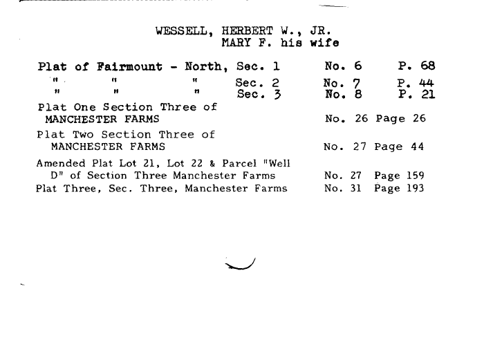 | WESSELL, HERBERT W., JR. MARY F. his wife Plat of Fairmount - North., Sec. 1 No. 6 P. 68 " " " Sec. 2 No. 7 P. 44 " " M Sec. 3 No. 8 P. 21 Plat One Section Three of MANCHESTER FARMS No. 26 Page 26 Plat Two Section Three of MANCHESTER FARMS No. 27 Page 44 Amended Plat Lot 21, Lot 22 & Parcel "Well D" of Section Three Manchester Farms No. 27 Page 159 Plat Three, Sec. Three, Manchester Farms No. 31 Page 193 |