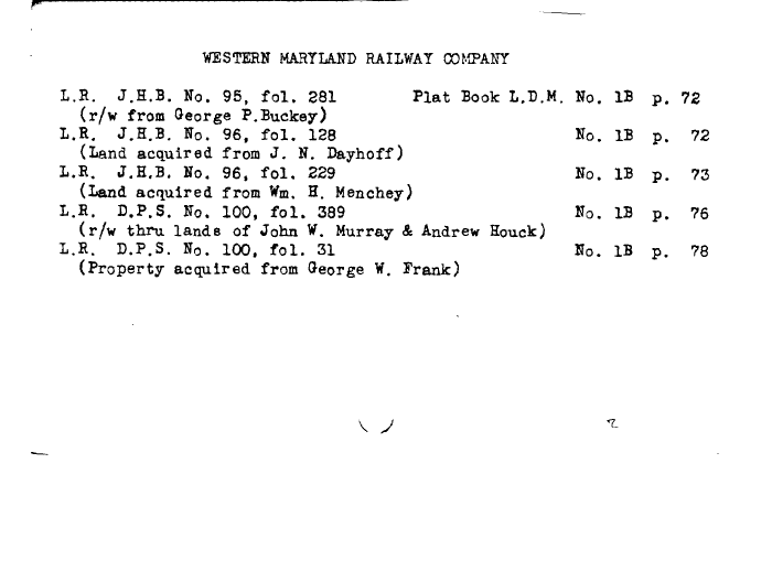 | WESTERN MARYLAND RAILWAY COMPANY L.R. J.H.B. No. 95, fol. 281 Plat Book L.D.M. No. IB p. 72 (r/w from George P.Buckey) L.R. J.H.B. No. 96, fol. 128 No. IB p. 72 (Land acquired from J. N. Dayhoff) L.R. J.H.B. No. 96, fol, 229 No. IB p. 73 (Land acquired from Vm. H. Menchey) L.R. D.P.S. No. 100, fol. 389 No. IB p. 76 (r/w thru lands of John W. Murray & Andrew Houck) L.R. D.P.S. No. 100, fol. 31 No. IB p. 78 (Property acquired from George W. Frank) |