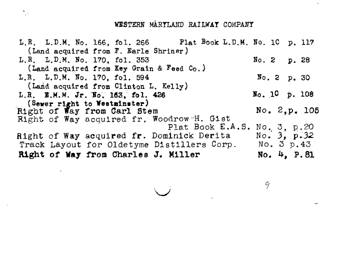 | WESTERN MiEYLAHD RAILWAY COMPANY L.R. L.D.M. No. 166, fol. 266 Plat Book L.D.M. No. 1C p. 117 (Land acquired from F. Earle Shriner) L.R. L.D.M. No. 170, fol. 353 No. 2 p. 28 (Land acquired from Key Grain & Feed Co.) L.R. L.D.M. No. 170, fol. 594 No. 2 p. 30 (Land acquired from Clinton L. Kelly) L.H. J.M.M. Jr. 'No. 165, fol. 426 No. .1C p. 108 (Sewer right to Westminster) Right of Way from Carl Stem No. 2,p. 105 Right of Way acquired fr. Woodrow-H. Gist Plat Book E.A.S. No.. 3, p.20 Right of Way acquired fr. Dominick Derita No. 3, p-32 Track Layout for Oldetyme Distillers Corp. No. 3 p.43 Right of Way from Charles J. Miller No. 4, P.81 |