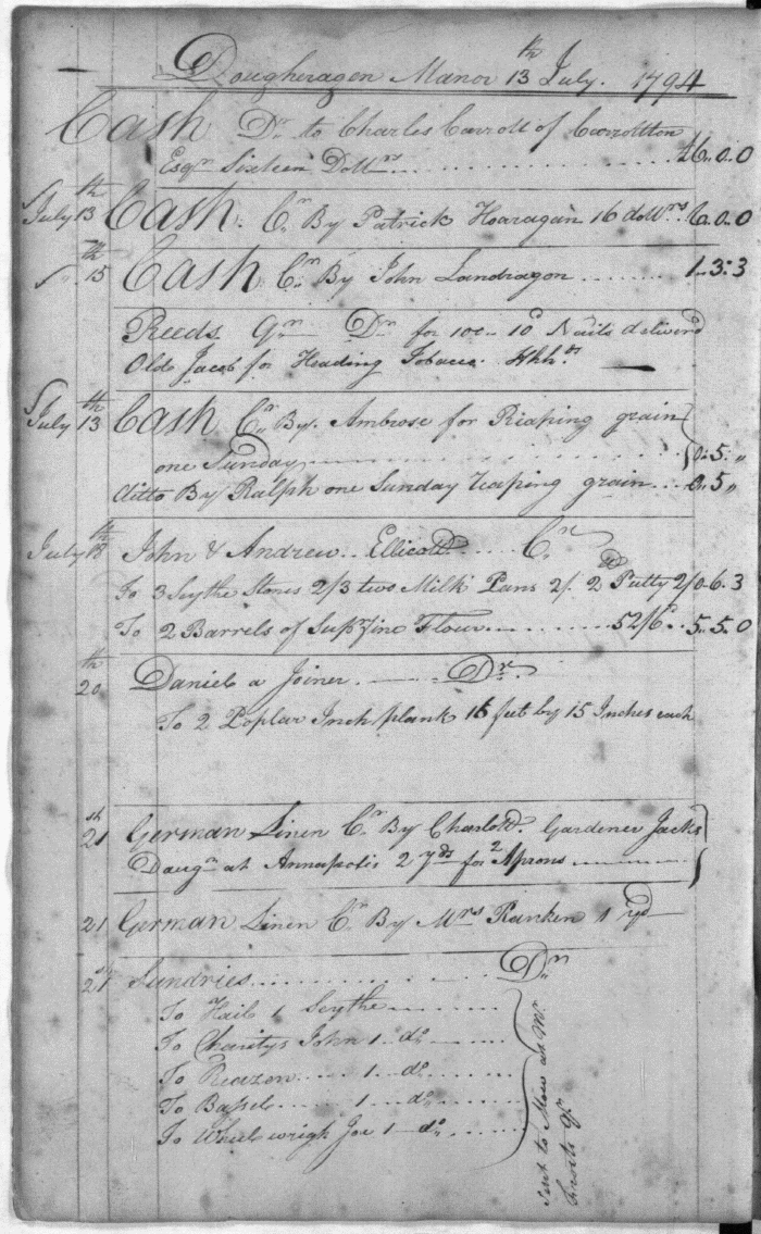 Carroll family account books for Doughoregan Manor, 1794-1803 HCHS RA 27&28/MSA SC 5465 ra27-0015 Enlarge and print image (906K) << PREVIOUS NEXT >> |