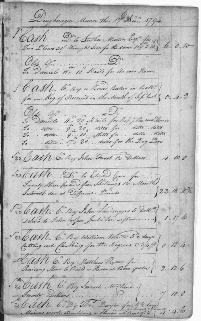 Carroll family account books for Doughoregan Manor, 1794-1803 HCHS RA 27&28/MSA SC 5465 ra27-0034 Enlarge and print image (938K) << PREVIOUS NEXT >> |