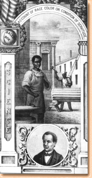 There were other blacks who were champions of science and industry. Isaac Myers, a prominent black entrepreneur and president of the celebration had one of the largest shipbuilding facilities in the Fells Point area. See Douglass' speech, and the newspaper accounts for more details. Hiram Revels, pictured below, was one of the first black Senators in Congress. The text of the Fifteenth Amendment follows across the arches. |