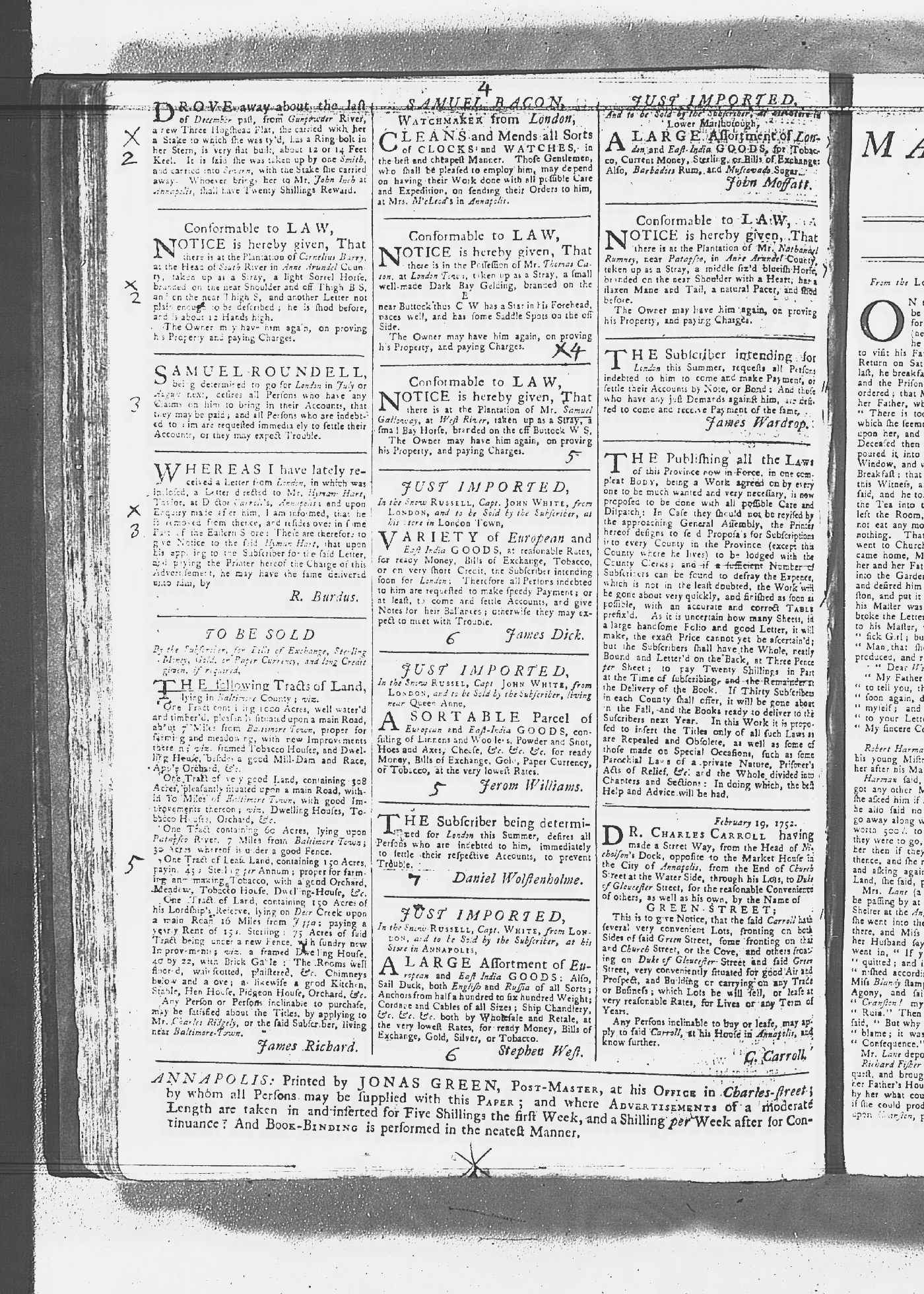 Maryland Gazette Collection MSA SC 2731 January 2, 1752 - October 19, 1758 M 1279 A Publication of the Archives of Maryland Online Image No: 104 Enlarge and print image (2M) |