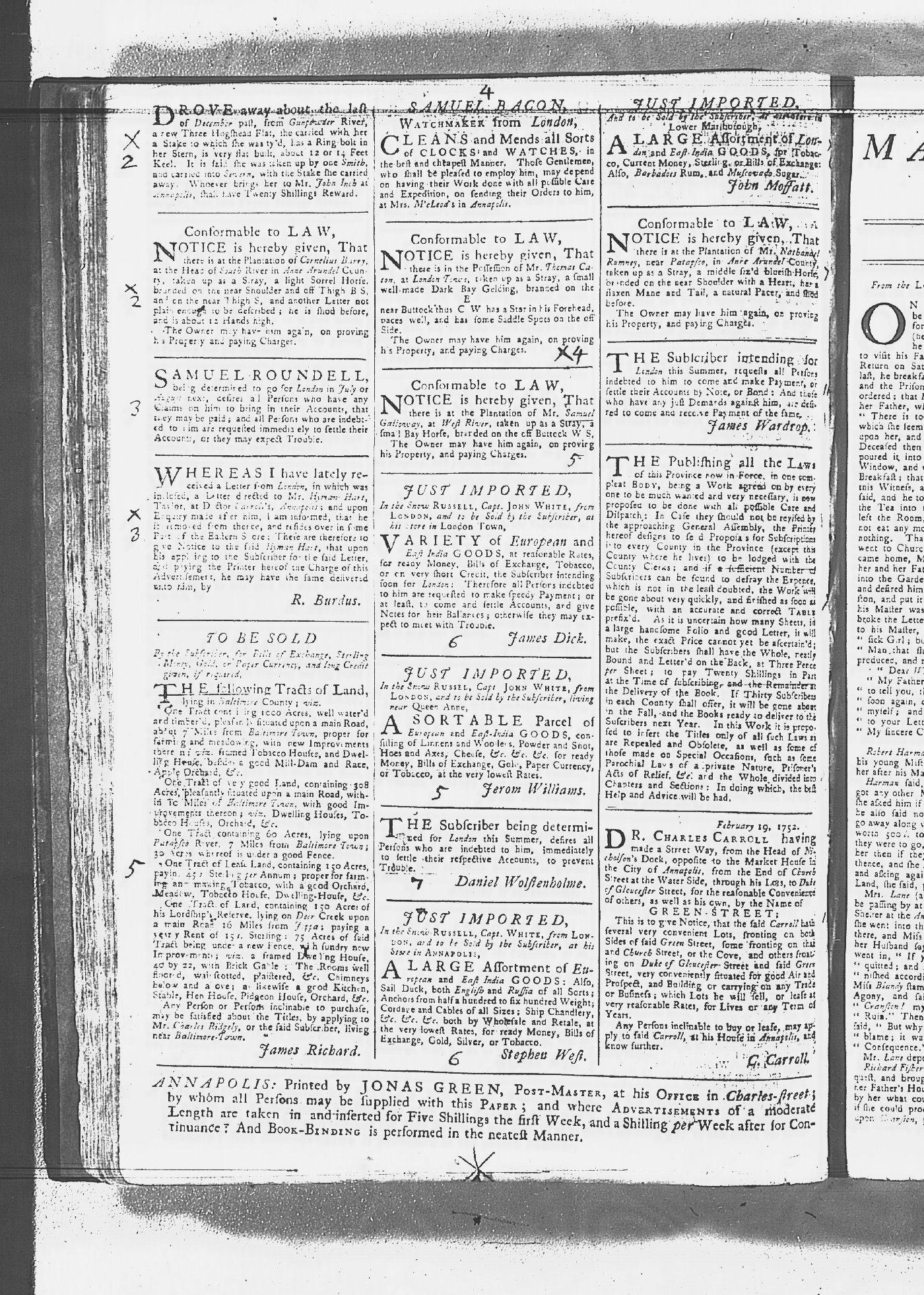 Maryland Gazette Collection MSA SC 2731 January 2, 1752 - October 19, 1758 M 1279 A Publication of the Archives of Maryland Online Image No: 108 Enlarge and print image (2M) |