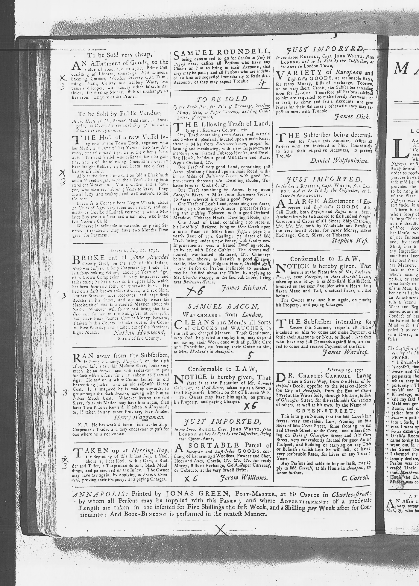 Maryland Gazette Collection MSA SC 2731 January 2, 1752 - October 19, 1758 M 1279 A Publication of the Archives of Maryland Online Image No: 112 Enlarge and print image (2M) |