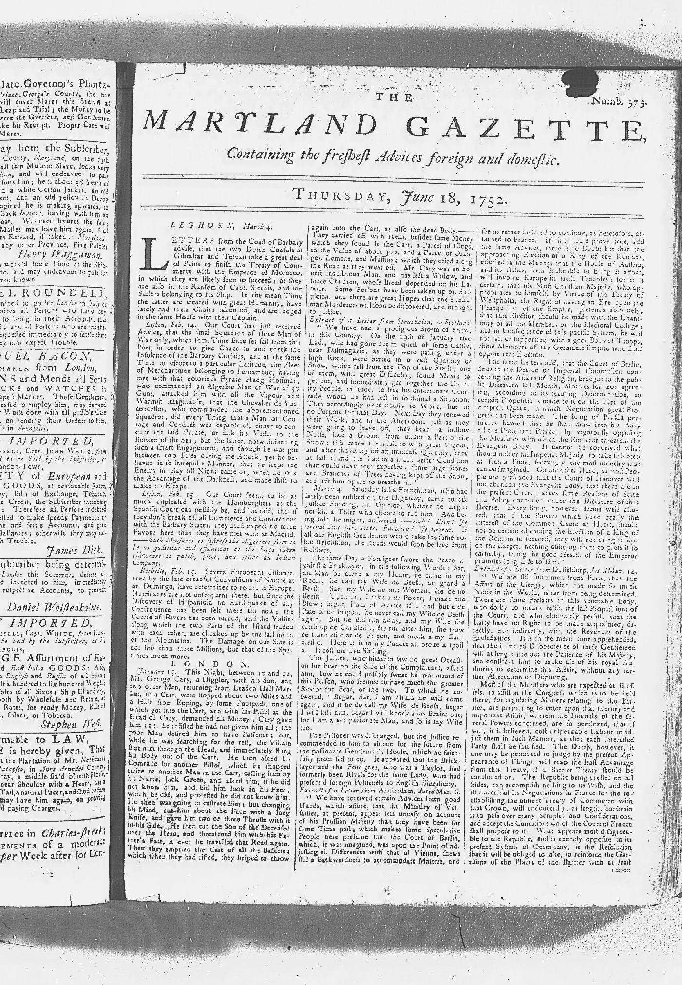 Maryland Gazette Collection MSA SC 2731 January 2, 1752 - October 19, 1758 M 1279 A Publication of the Archives of Maryland Online Image No: 117 Enlarge and print image (2M) |