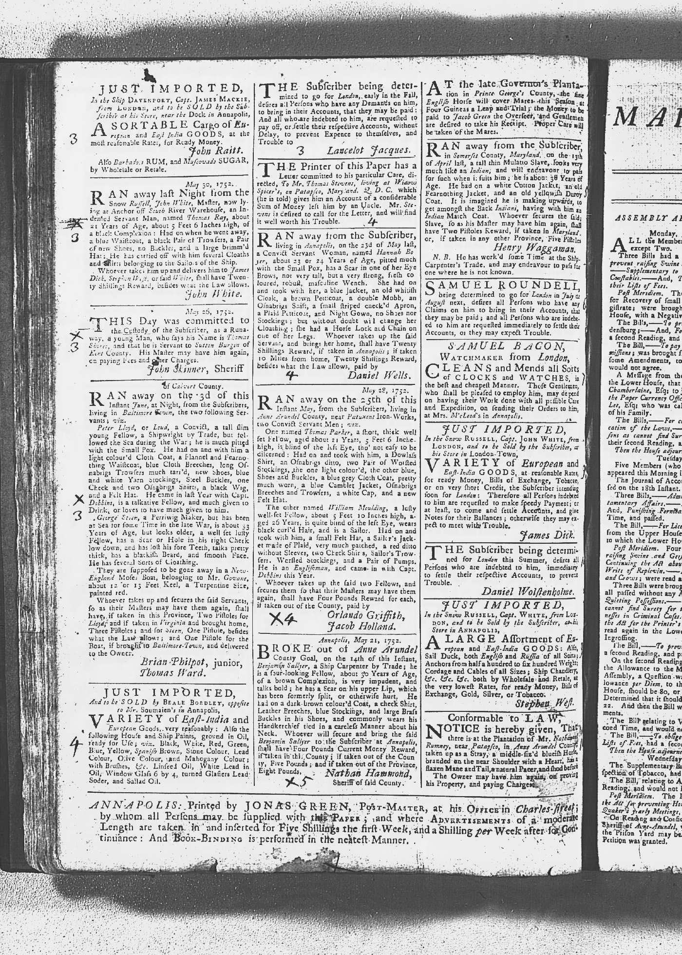 Maryland Gazette Collection MSA SC 2731 January 2, 1752 - October 19, 1758 M 1279 A Publication of the Archives of Maryland Online Image No: 120 Enlarge and print image (3M) |
