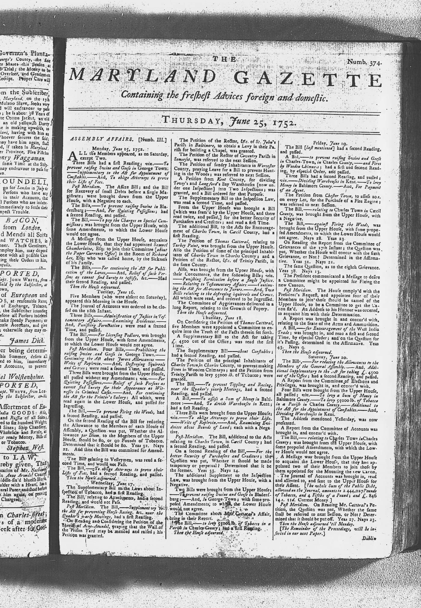 Maryland Gazette Collection MSA SC 2731 January 2, 1752 - October 19, 1758 M 1279 A Publication of the Archives of Maryland Online Image No: 121 Enlarge and print image (3M) |