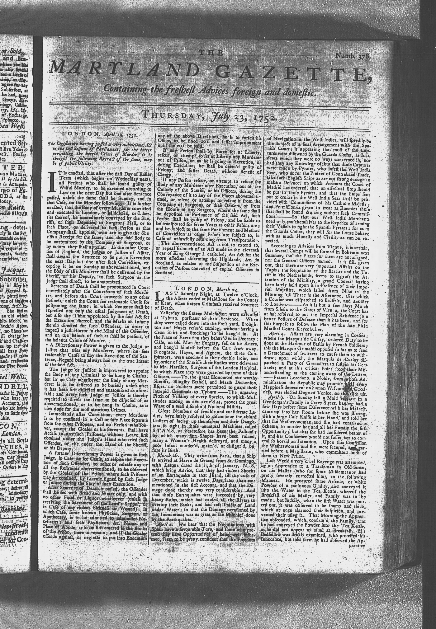 Maryland Gazette Collection MSA SC 2731 January 2, 1752 - October 19, 1758 M 1279 A Publication of the Archives of Maryland Online Image No: 137 Enlarge and print image (3M) |