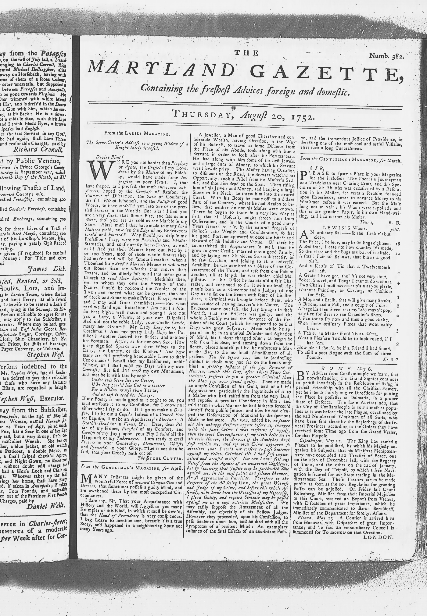 Maryland Gazette Collection MSA SC 2731 January 2, 1752 - October 19, 1758 M 1279 A Publication of the Archives of Maryland Online Image No: 153 Enlarge and print image (2M) |