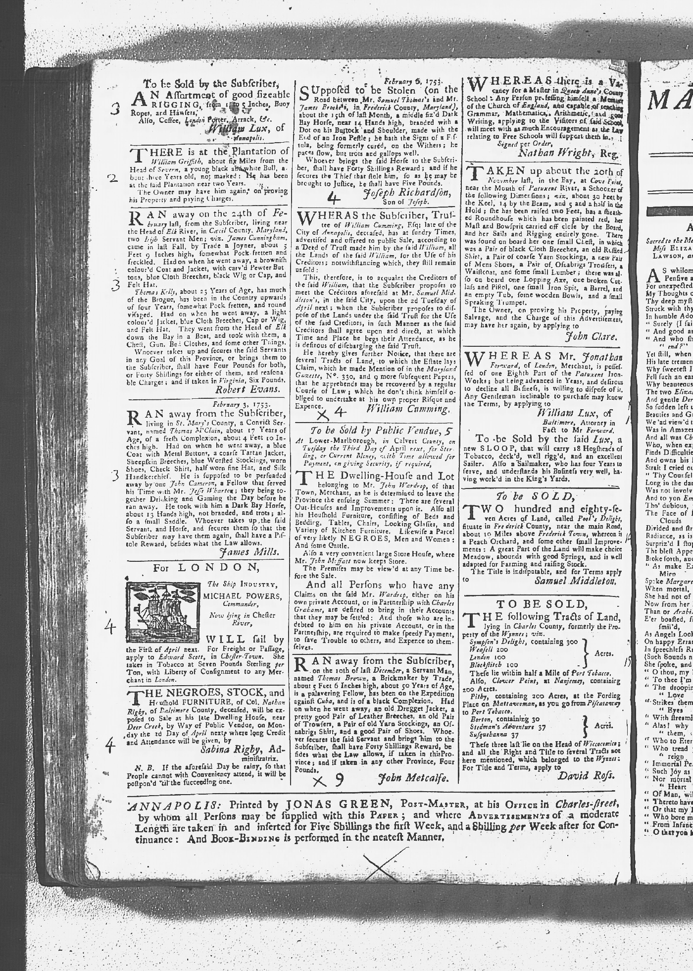 Maryland Gazette Collection MSA SC 2731 January 2, 1752 - October 19, 1758 M 1279 A Publication of the Archives of Maryland Online Image No: 261 Enlarge and print image (3M) |