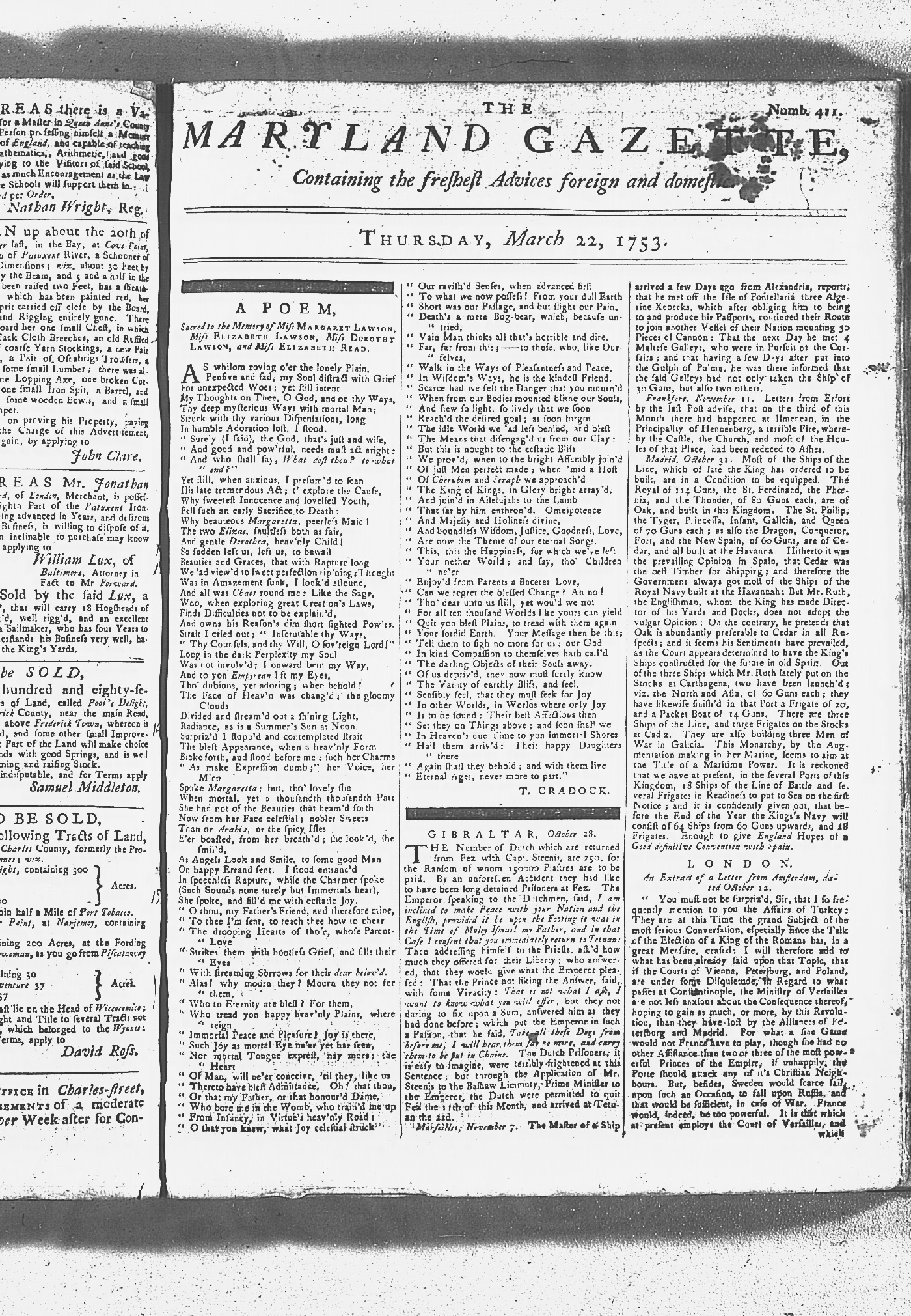 Maryland Gazette Collection MSA SC 2731 January 2, 1752 - October 19, 1758 M 1279 A Publication of the Archives of Maryland Online Image No: 262 Enlarge and print image (3M) |