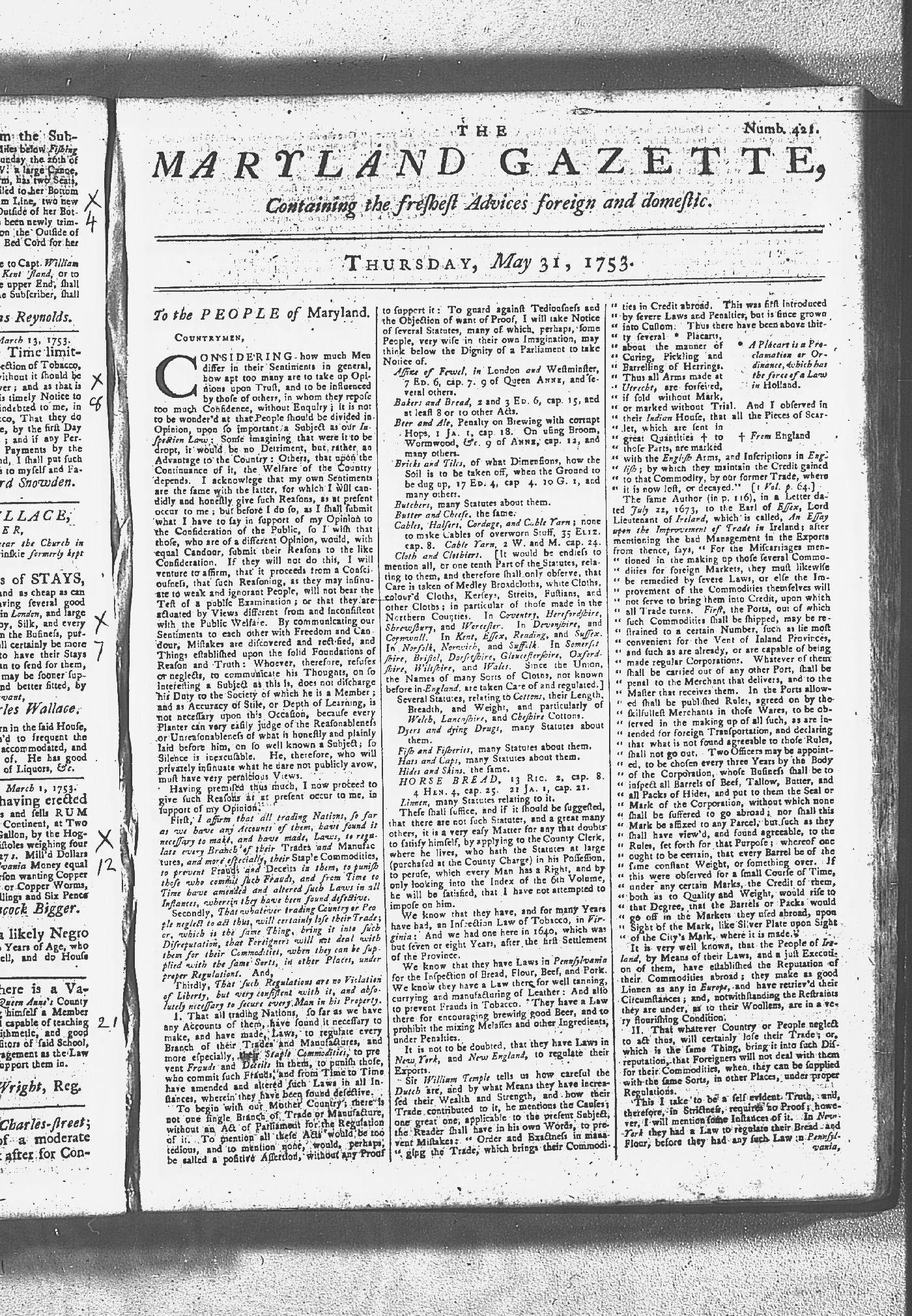 Maryland Gazette Collection MSA SC 2731 January 2, 1752 - October 19, 1758 M 1279 A Publication of the Archives of Maryland Online Image No: 304 Enlarge and print image (3M) |