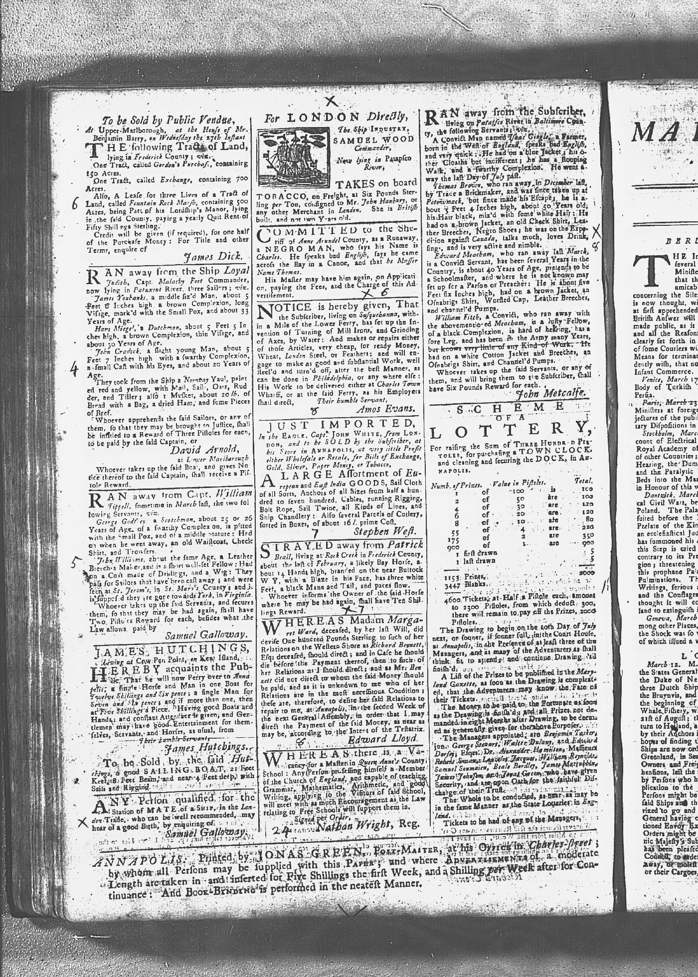Maryland Gazette Collection MSA SC 2731 January 2, 1752 - October 19, 1758 M 1279 A Publication of the Archives of Maryland Online Image No: 317 Enlarge and print image (3M) |