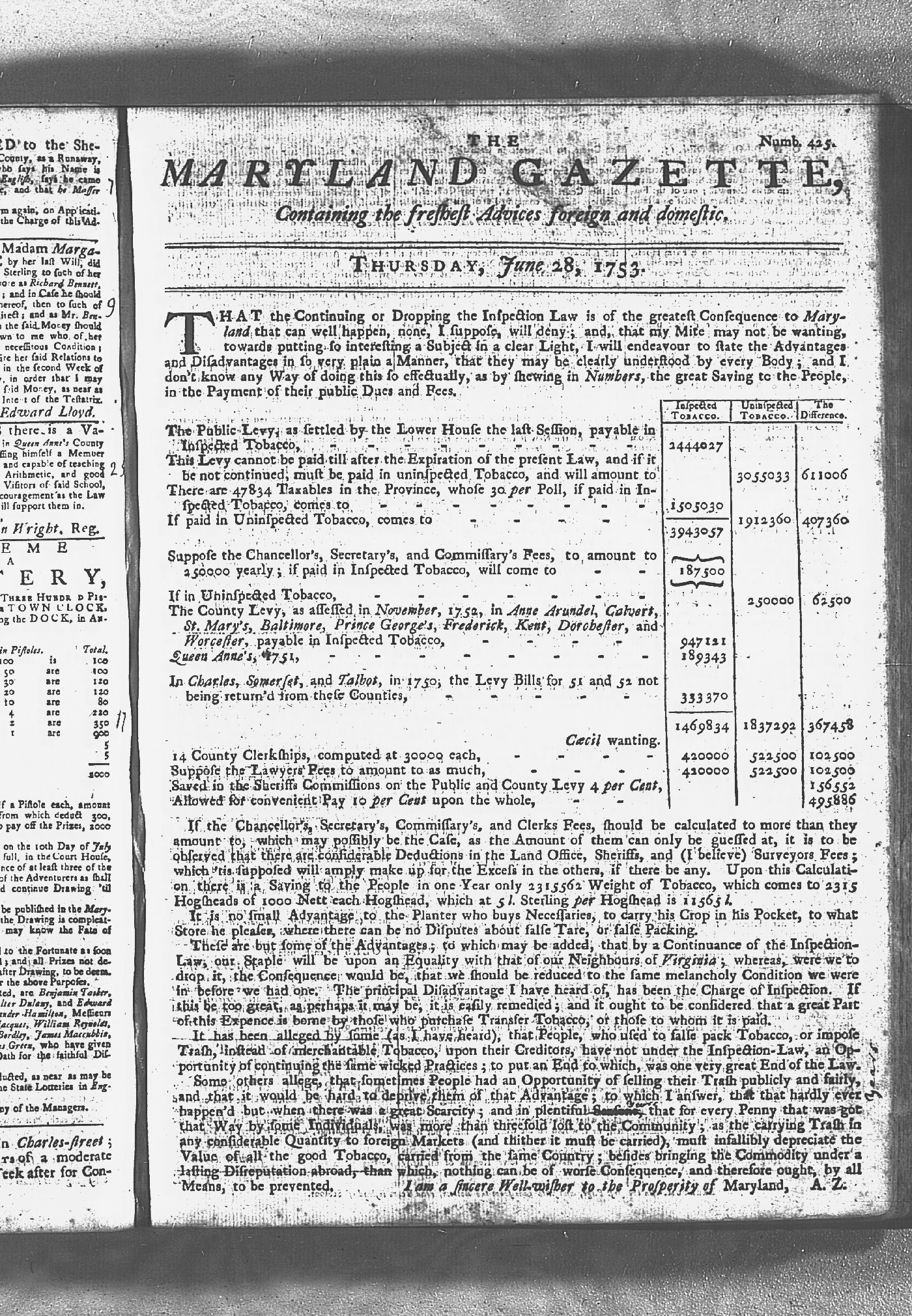 Maryland Gazette Collection MSA SC 2731 January 2, 1752 - October 19, 1758 M 1279 A Publication of the Archives of Maryland Online Image No: 322 Enlarge and print image (3M) |