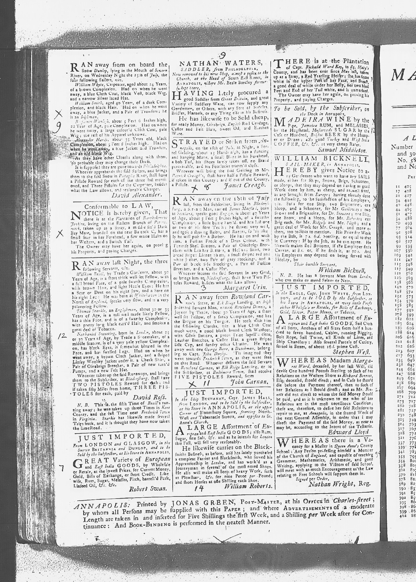 Maryland Gazette Collection MSA SC 2731 January 2, 1752 - October 19, 1758 M 1279 A Publication of the Archives of Maryland Online Image No: 373 Enlarge and print image (2M) |