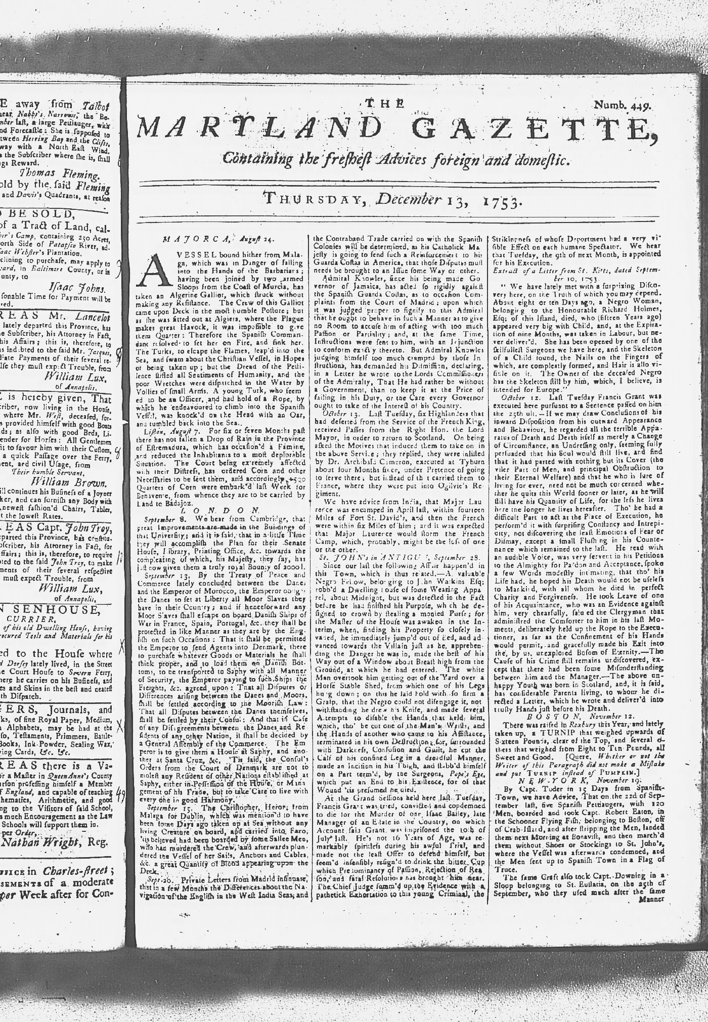 Maryland Gazette Collection MSA SC 2731 January 2, 1752 - October 19, 1758 M 1279 A Publication of the Archives of Maryland Online Image No: 418 Enlarge and print image (3M) |