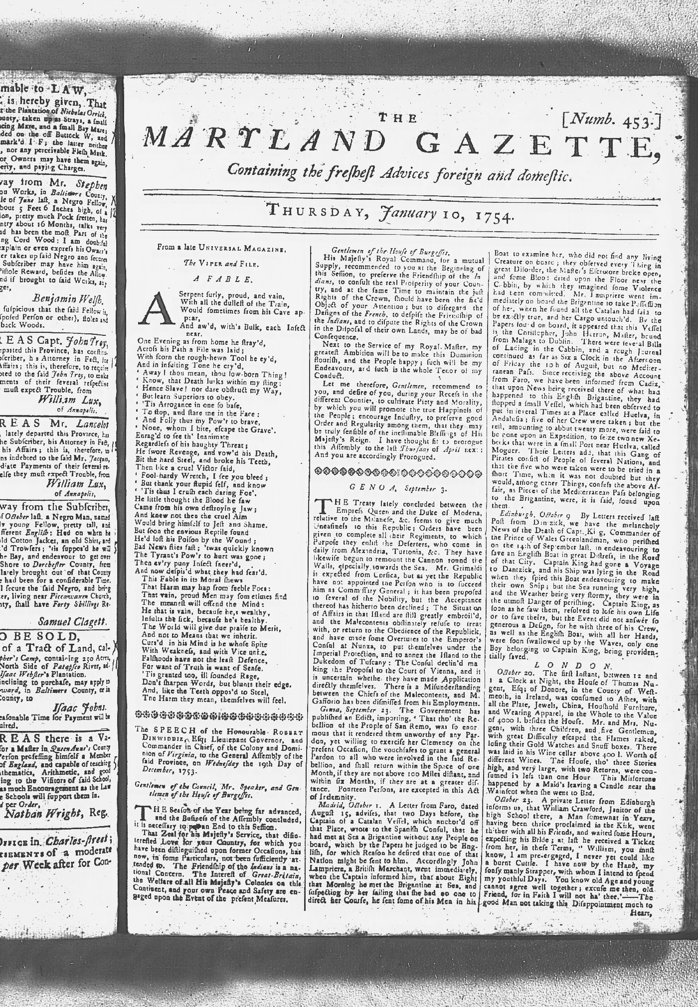 Maryland Gazette Collection MSA SC 2731 January 2, 1752 - October 19, 1758 M 1279 A Publication of the Archives of Maryland Online Image No: 430 Enlarge and print image (3M) |