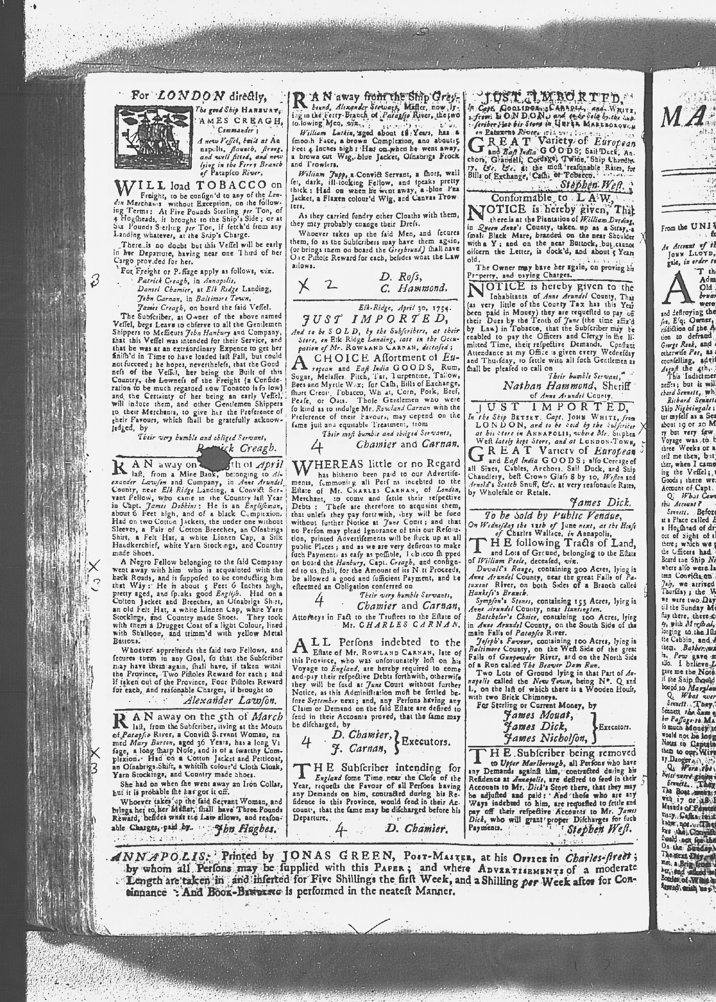 Maryland Gazette Collection MSA SC 2731 January 2, 1752 - October 19, 1758 M 1279 A Publication of the Archives of Maryland Online Image No: 501 Enlarge and print image (3M) |
