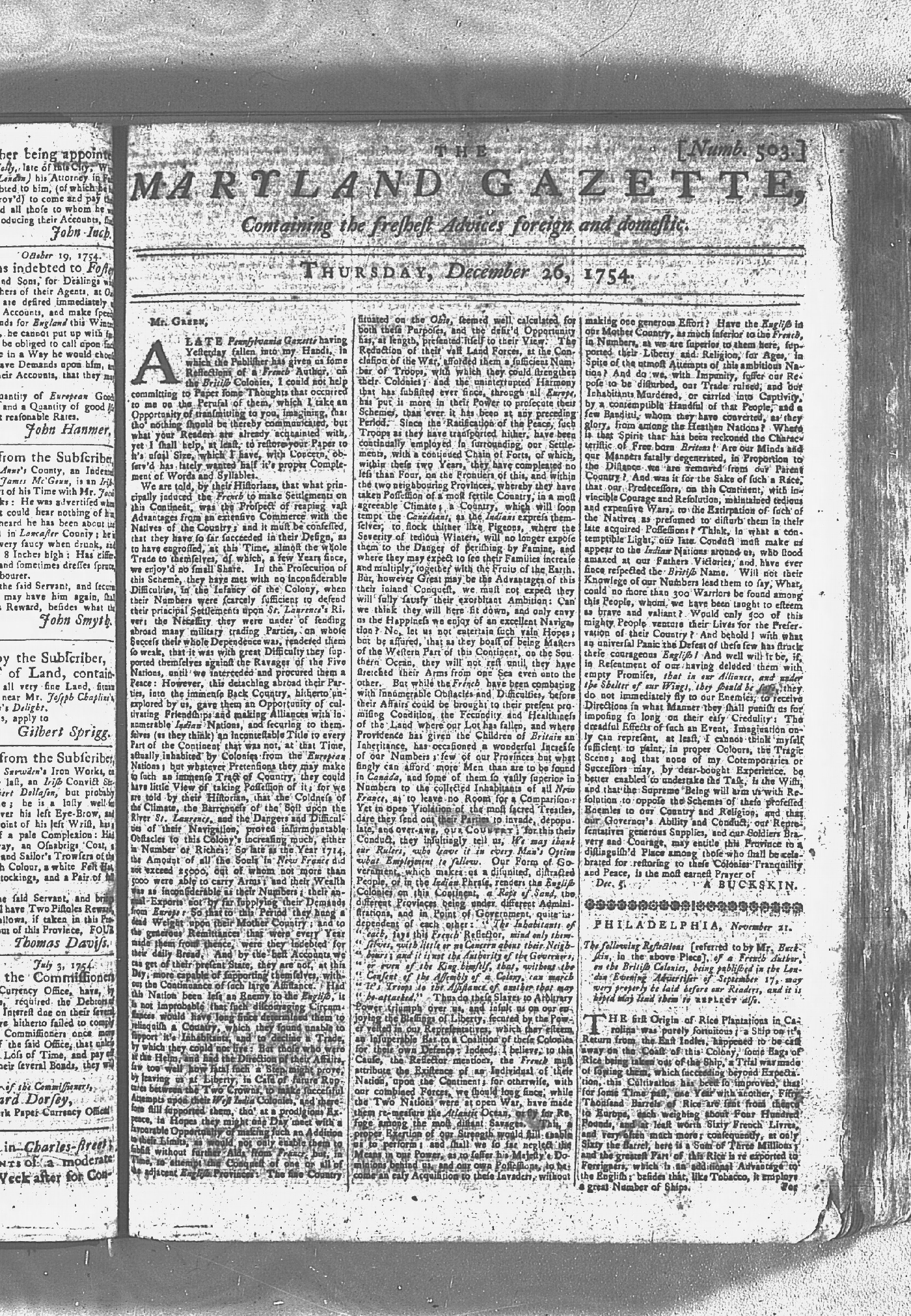 Maryland Gazette Collection MSA SC 2731 January 2, 1752 - October 19, 1758 M 1279 A Publication of the Archives of Maryland Online Image No: 628 Enlarge and print image (3M) |