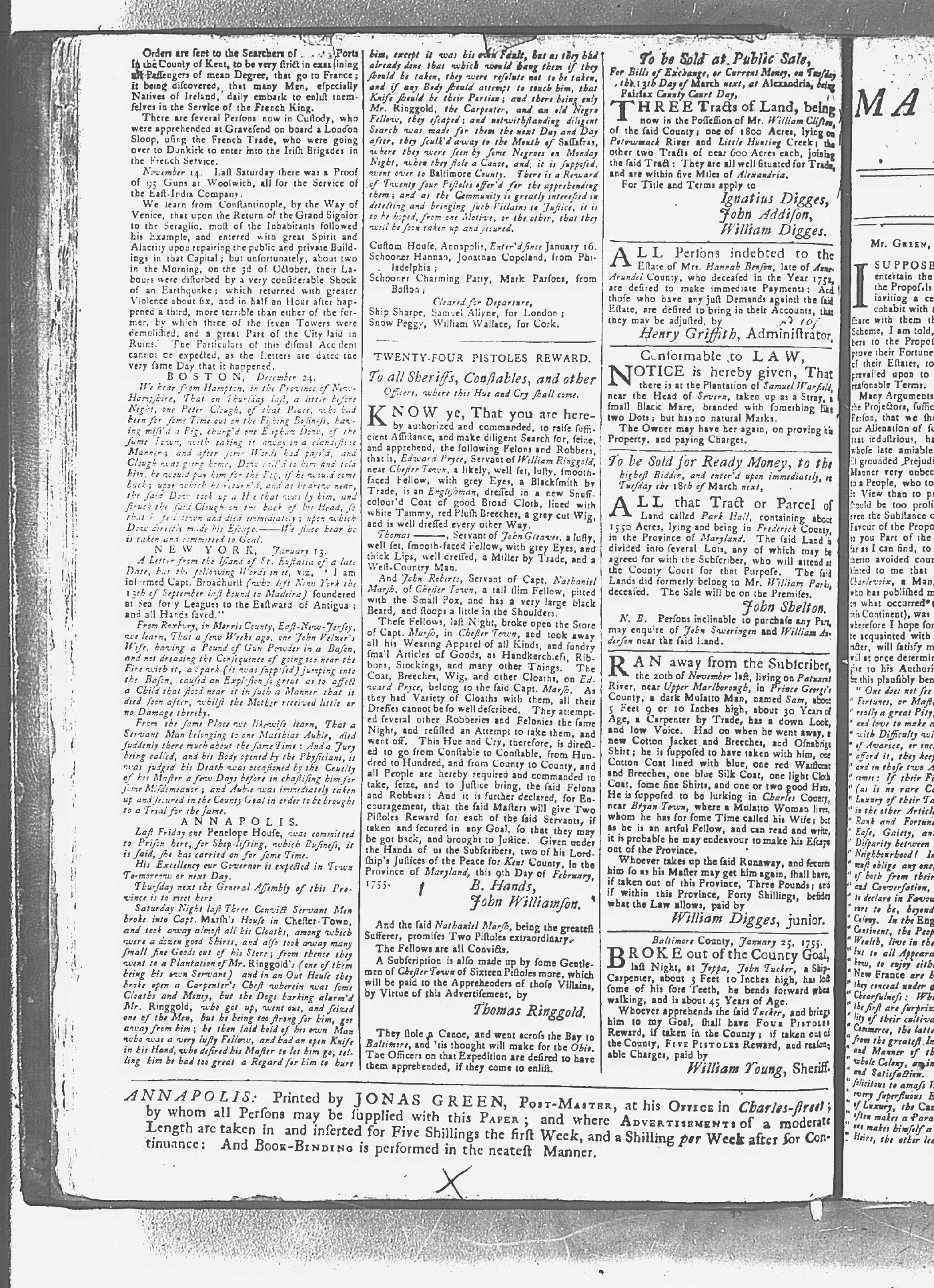 Maryland Gazette Collection MSA SC 2731 January 2, 1752 - October 19, 1758 M 1279 A Publication of the Archives of Maryland Online Image No: 659 Enlarge and print image (2M) |