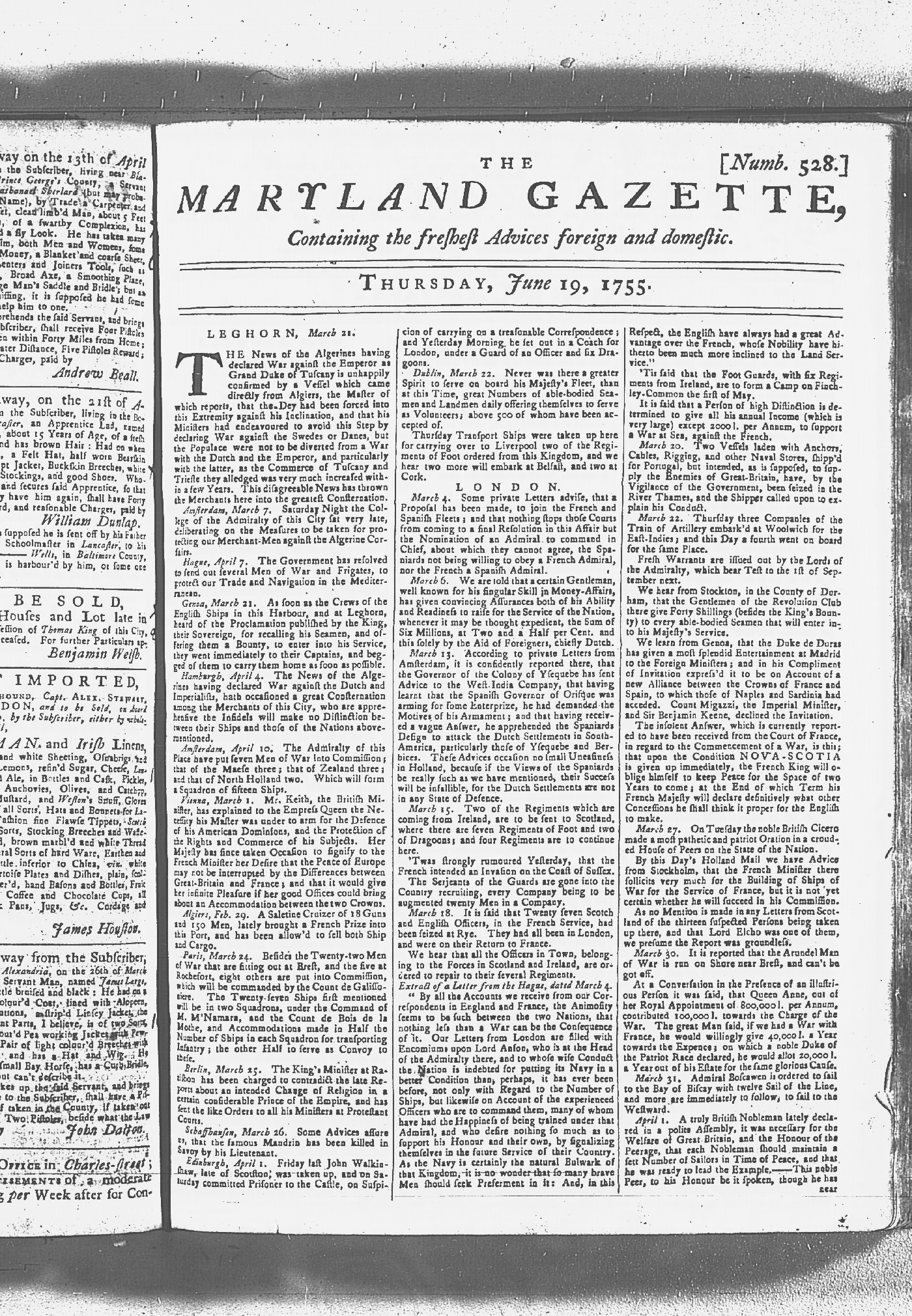 Maryland Gazette Collection MSA SC 2731 January 2, 1752 - October 19, 1758 M 1279 A Publication of the Archives of Maryland Online Image No: 730 Enlarge and print image (3M) |