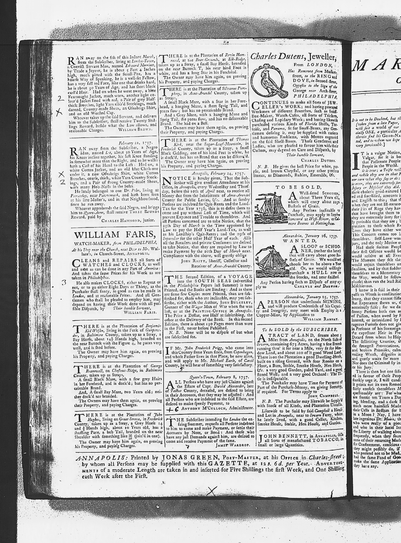 Maryland Gazette Collection MSA SC 2731 January 2, 1752 - October 19, 1758 M 1279 A Publication of the Archives of Maryland Online Image No: 1107 Enlarge and print image (3M) |