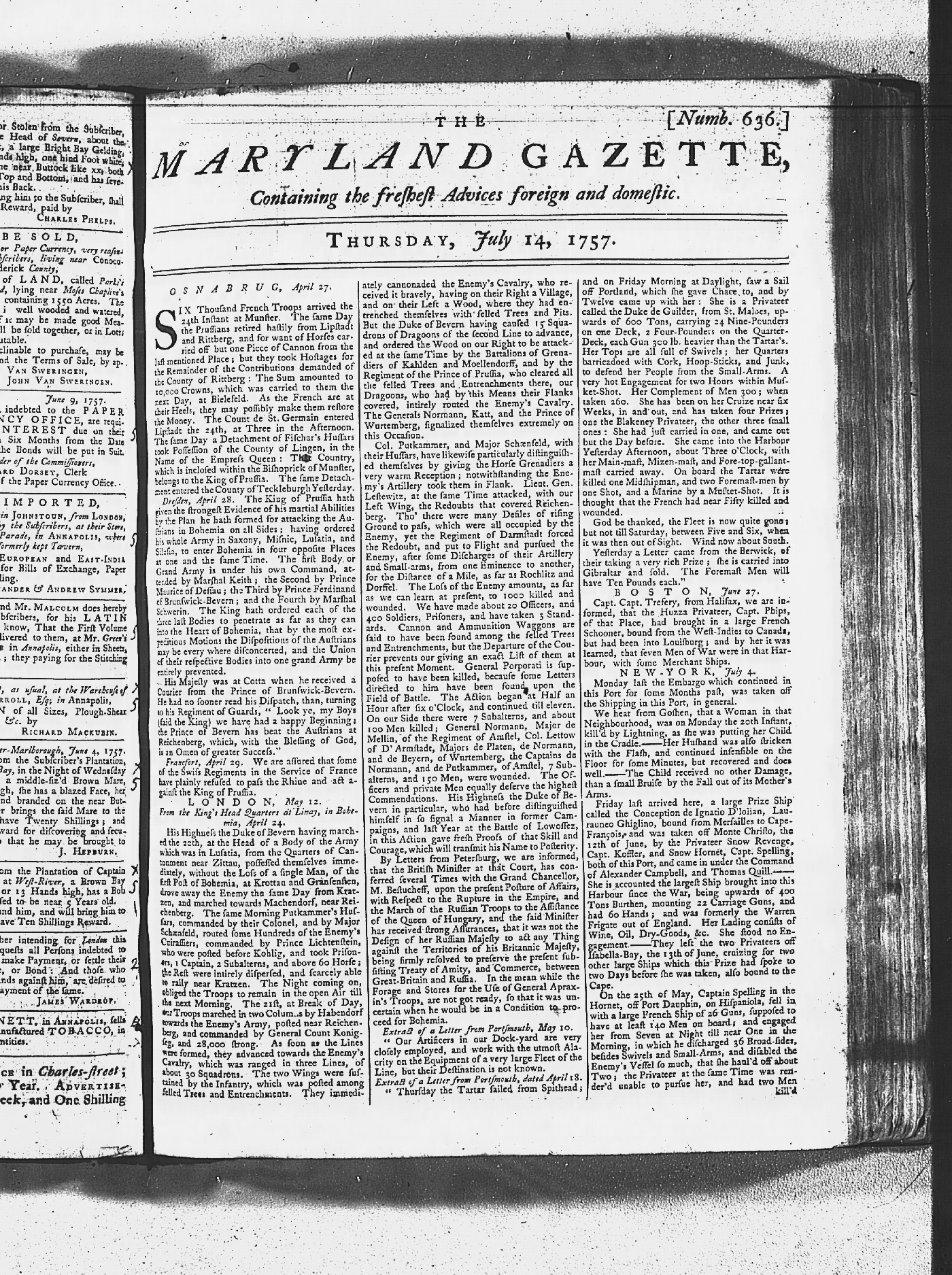 Maryland Gazette Collection MSA SC 2731 January 2, 1752 - October 19, 1758 M 1279 A Publication of the Archives of Maryland Online Image No: 1174 Enlarge and print image (3M) |