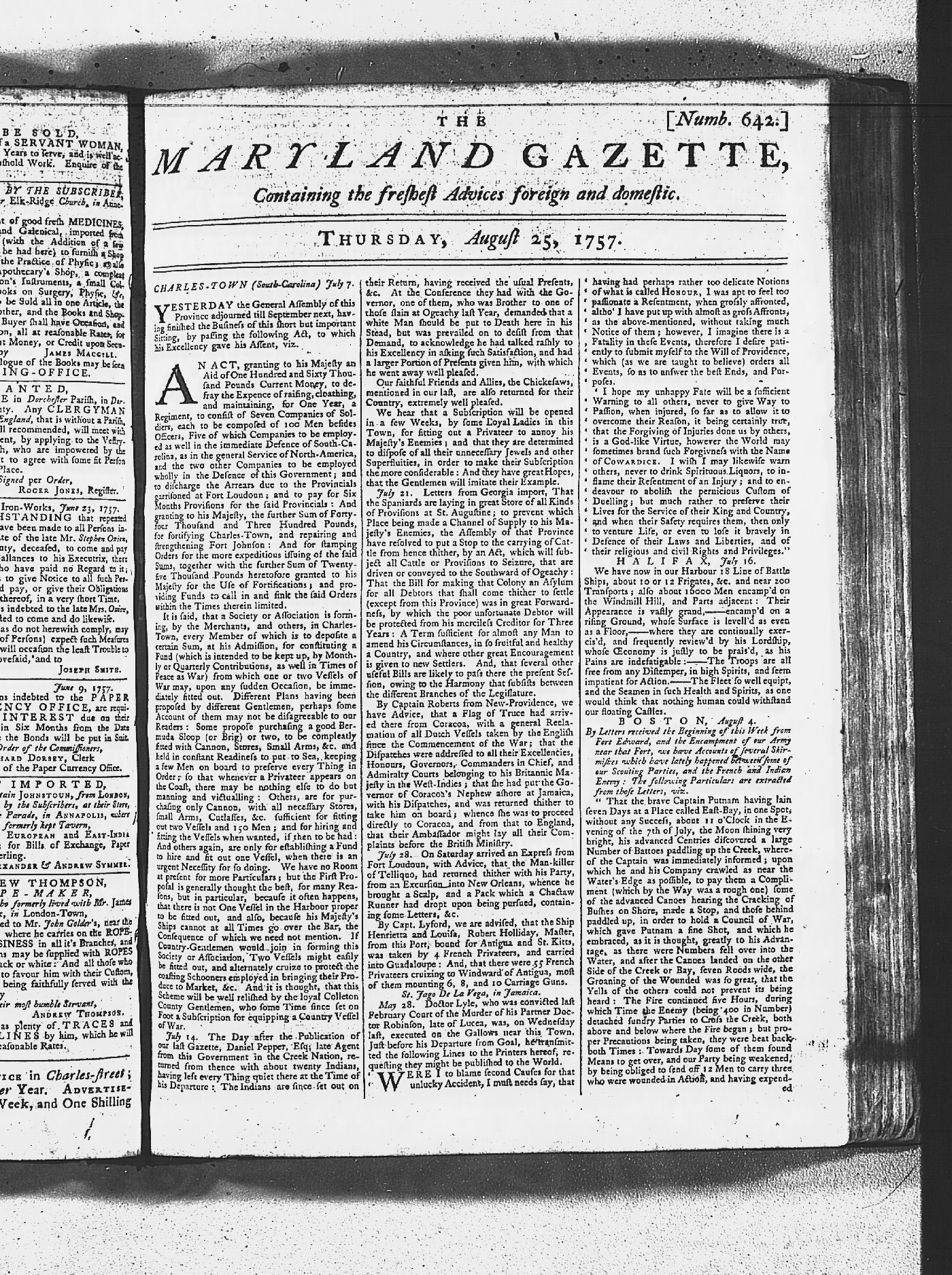 Maryland Gazette Collection MSA SC 2731 January 2, 1752 - October 19, 1758 M 1279 A Publication of the Archives of Maryland Online Image No: 1200 Enlarge and print image (3M) |