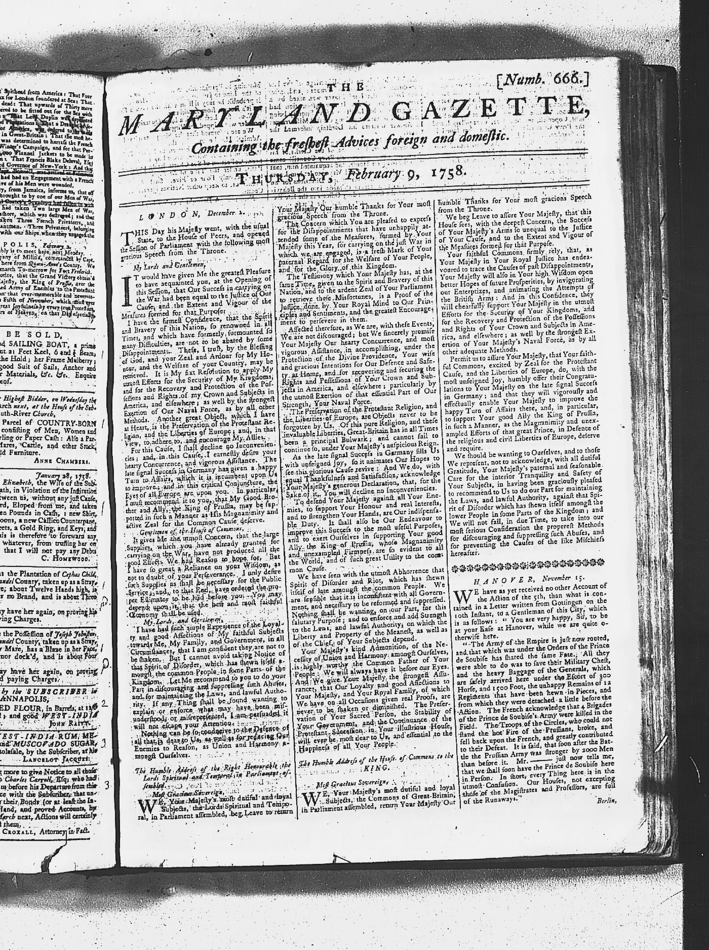 Maryland Gazette Collection MSA SC 2731 January 2, 1752 - October 19, 1758 M 1279 A Publication of the Archives of Maryland Online Image No: 1302 Enlarge and print image (3M) |