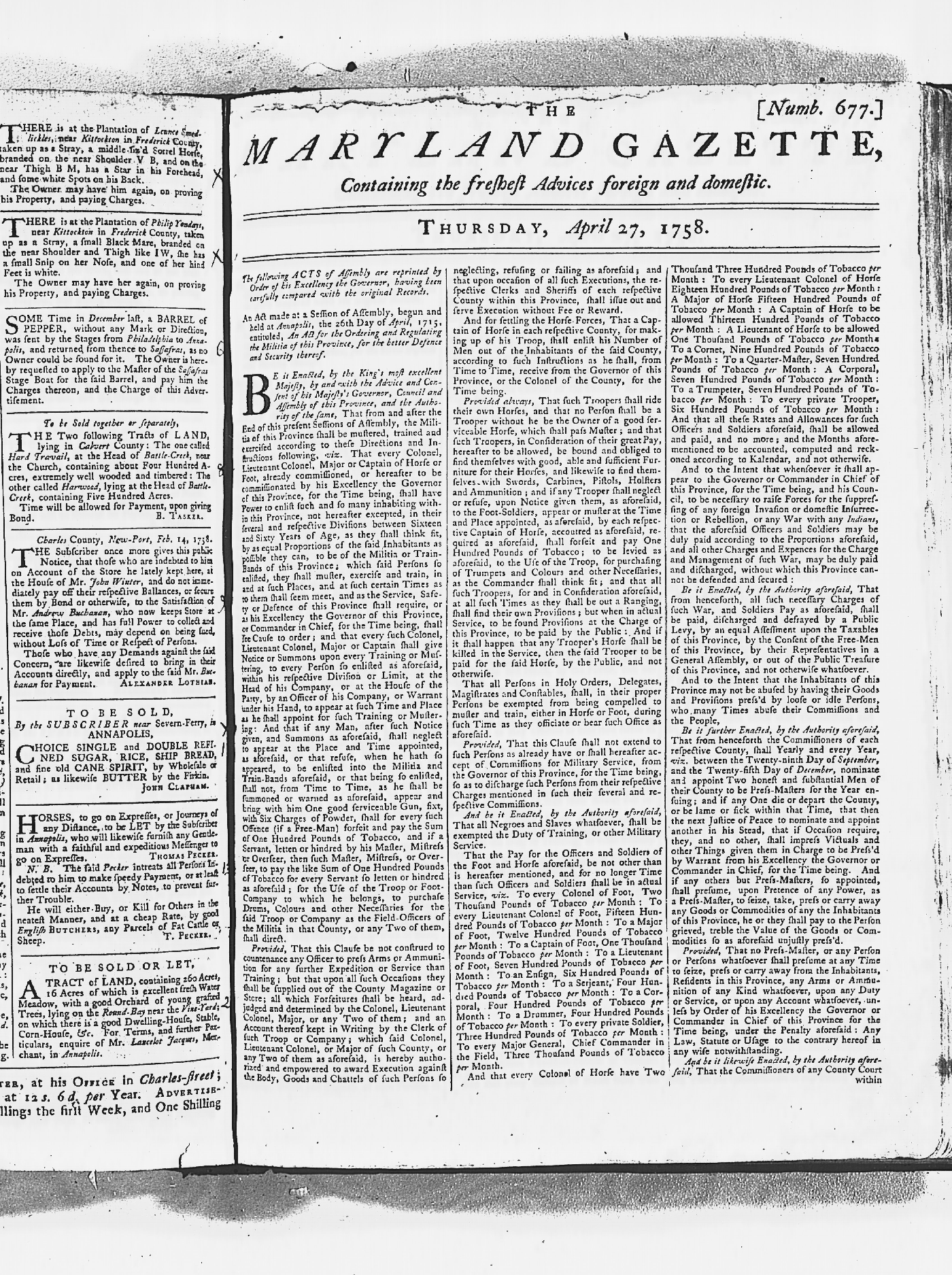 Maryland Gazette Collection MSA SC 2731 January 2, 1752 - October 19, 1758 M 1279 A Publication of the Archives of Maryland Online Image No: 1344 Enlarge and print image (3M) |