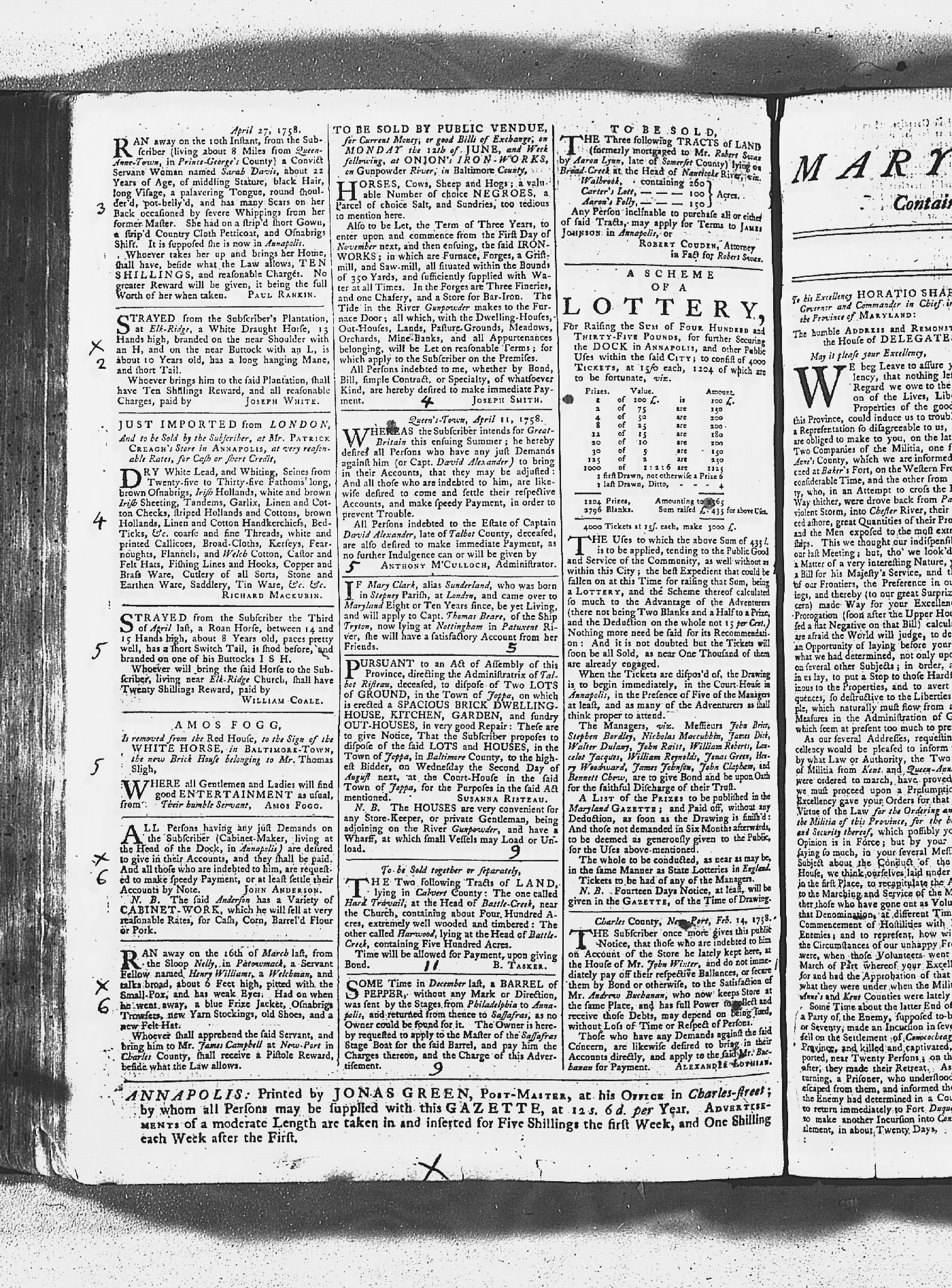 Maryland Gazette Collection MSA SC 2731 January 2, 1752 - October 19, 1758 M 1279 A Publication of the Archives of Maryland Online Image No: 1359 Enlarge and print image (3M) |