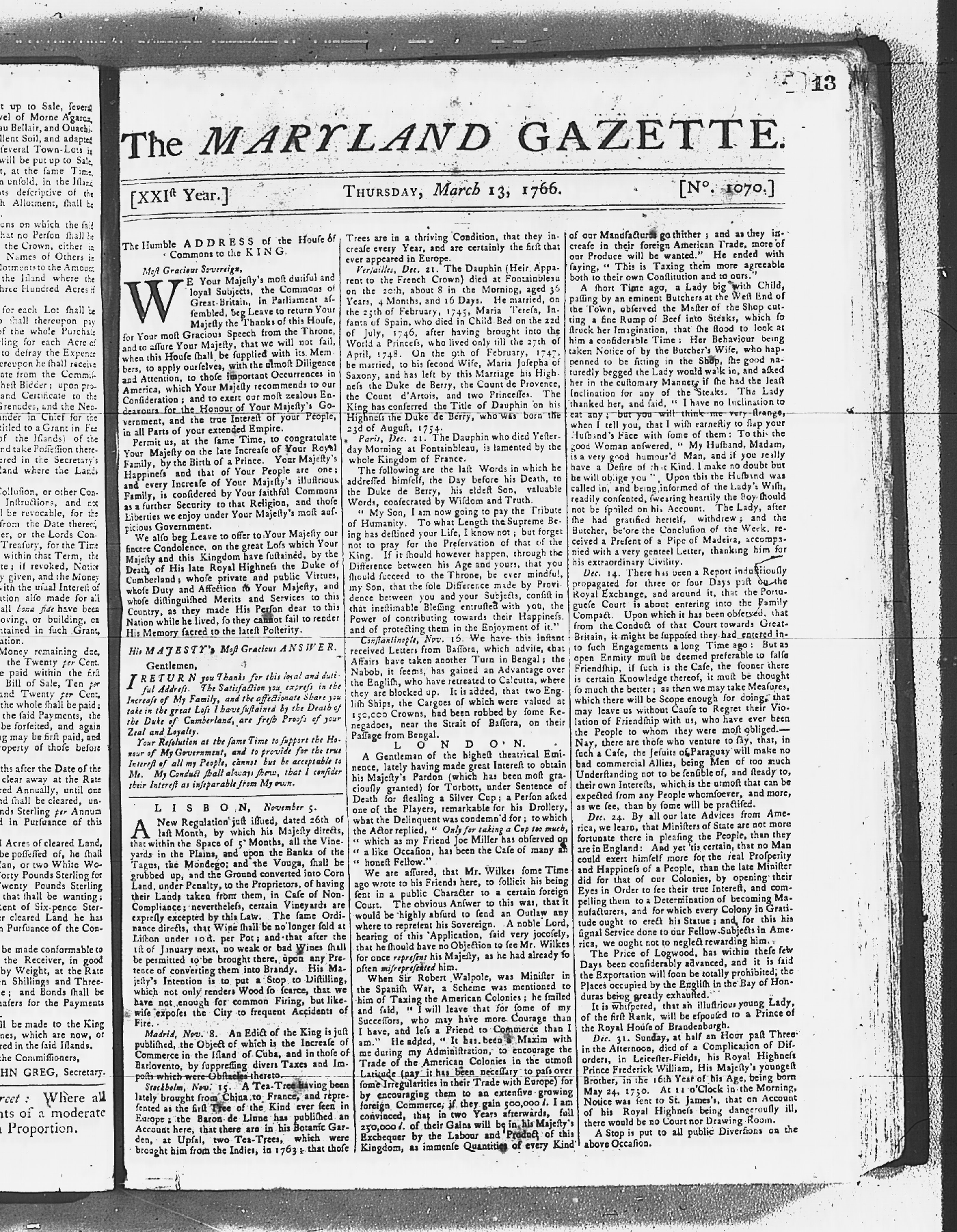 Maryland Gazette Collection MSA SC 2731 January 30, 1766 - December 26, 1771 M 1281 A Publication of the Archives of Maryland Online Image No: 20 Enlarge and print image (3M) |