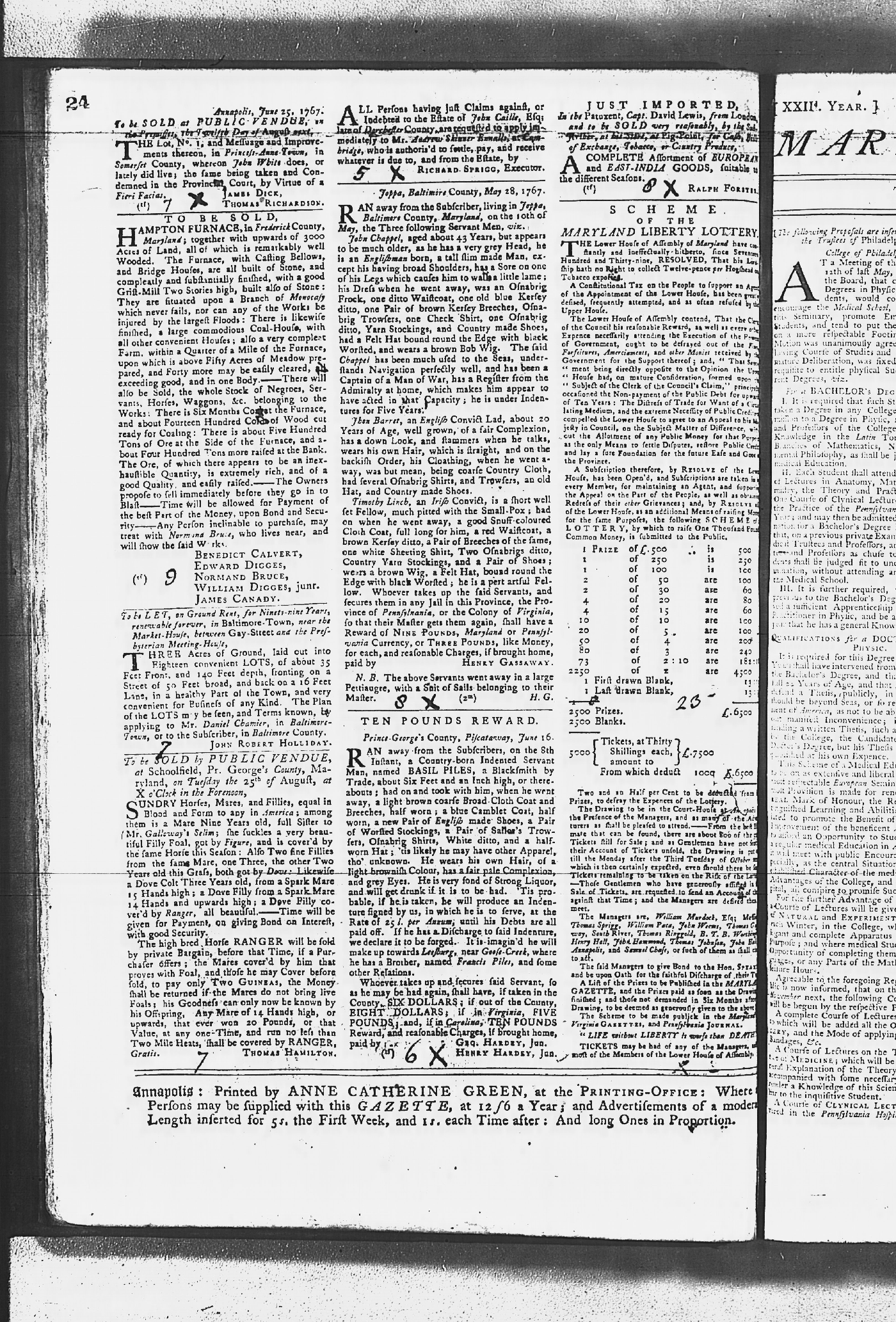 Maryland Gazette Collection MSA SC 2731 January 30, 1766 - December 26, 1771 M 1281 A Publication of the Archives of Maryland Online Image No: 371 Enlarge and print image (3M) |