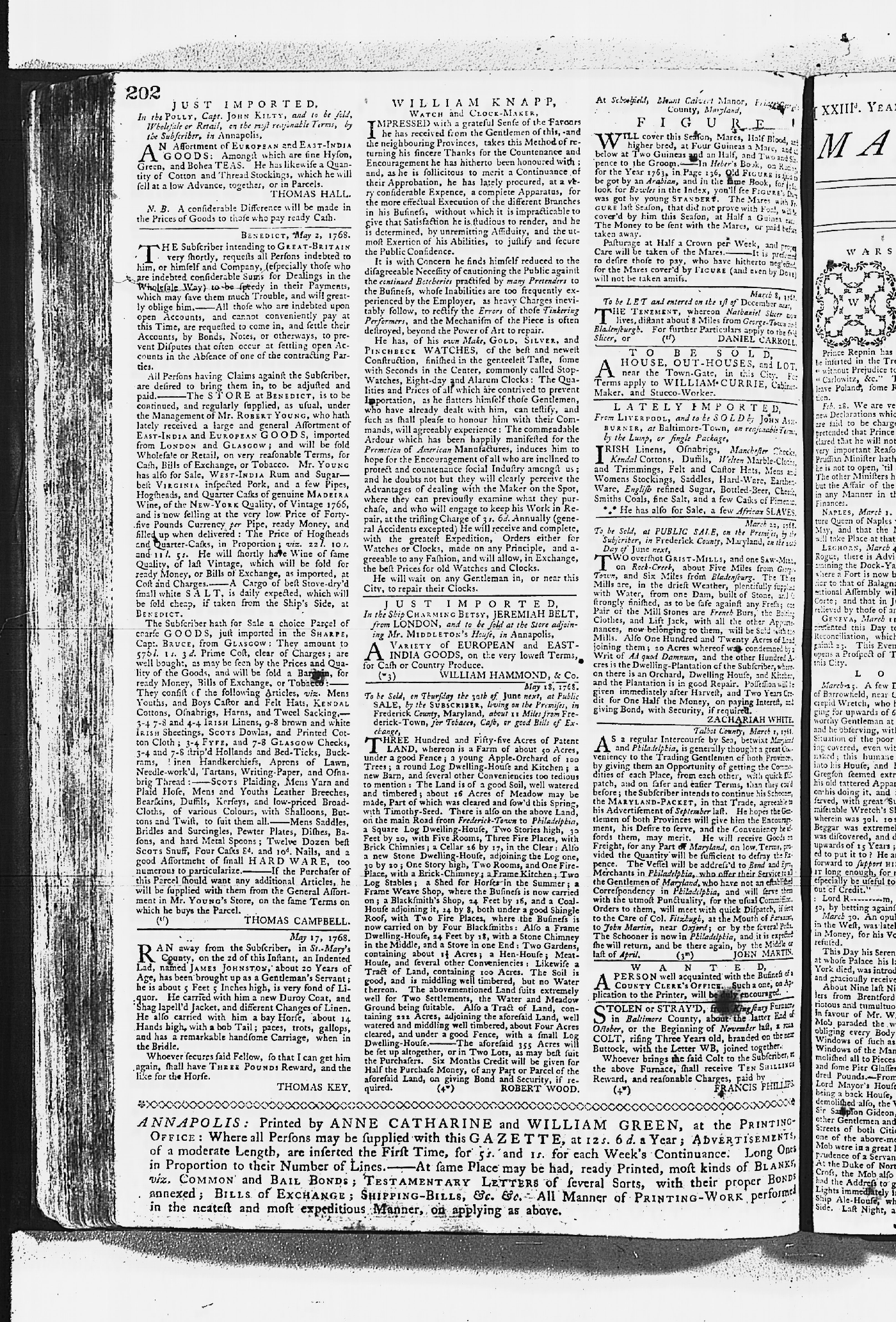 Maryland Gazette Collection MSA SC 2731 January 30, 1766 - December 26, 1771 M 1281 A Publication of the Archives of Maryland Online Image No: 579 Enlarge and print image (4M) |