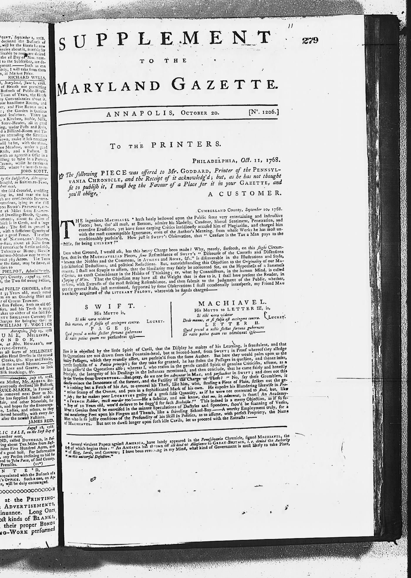 Maryland Gazette Collection MSA SC 2731 January 30, 1766 - December 26, 1771 M 1281 A Publication of the Archives of Maryland Online Image No: 666 Enlarge and print image (2M) |