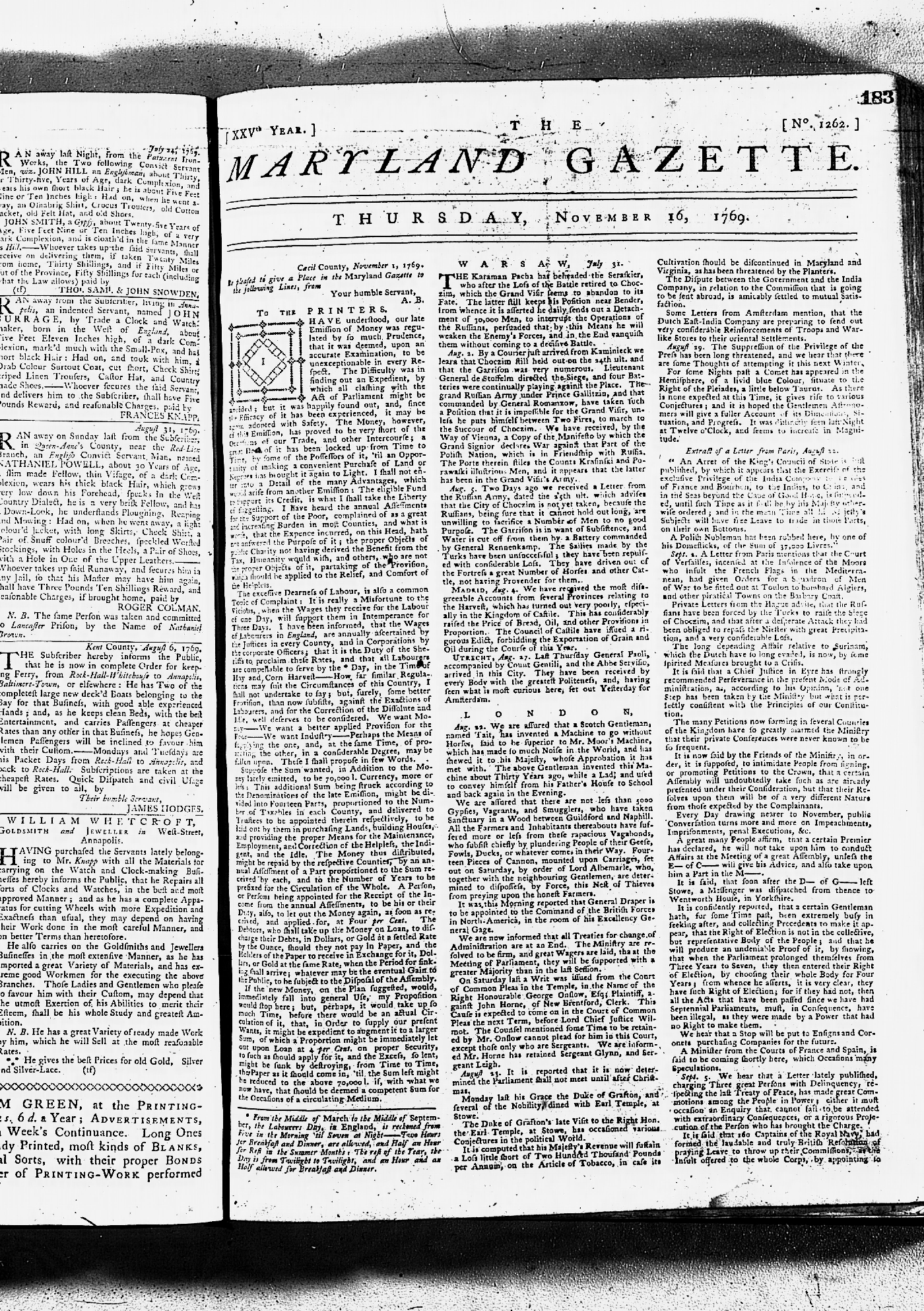 Maryland Gazette Collection MSA SC 2731 January 30, 1766 - December 26, 1771 M 1281 A Publication of the Archives of Maryland Online Image No: 914 Enlarge and print image (4M) |