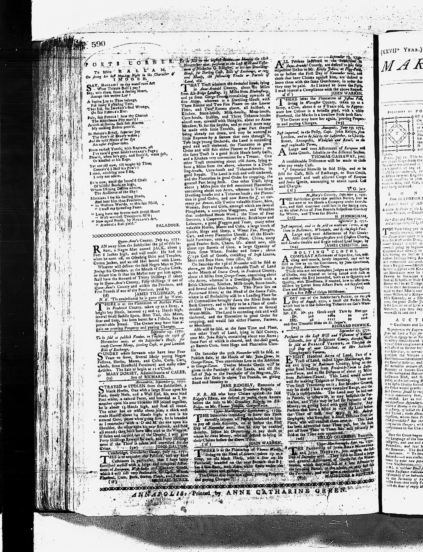 Maryland Gazette Collection MSA SC 2731 January 30, 1766 - December 26, 1771 M 1281 A Publication of the Archives of Maryland Online Image No: 1380 Enlarge and print image (4M) |