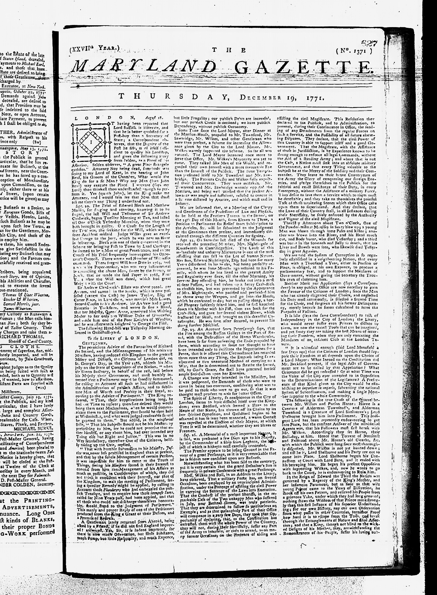 Maryland Gazette Collection MSA SC 2731 January 30, 1766 - December 26, 1771 M 1281 A Publication of the Archives of Maryland Online Image No: 1433 Enlarge and print image (4M) |
