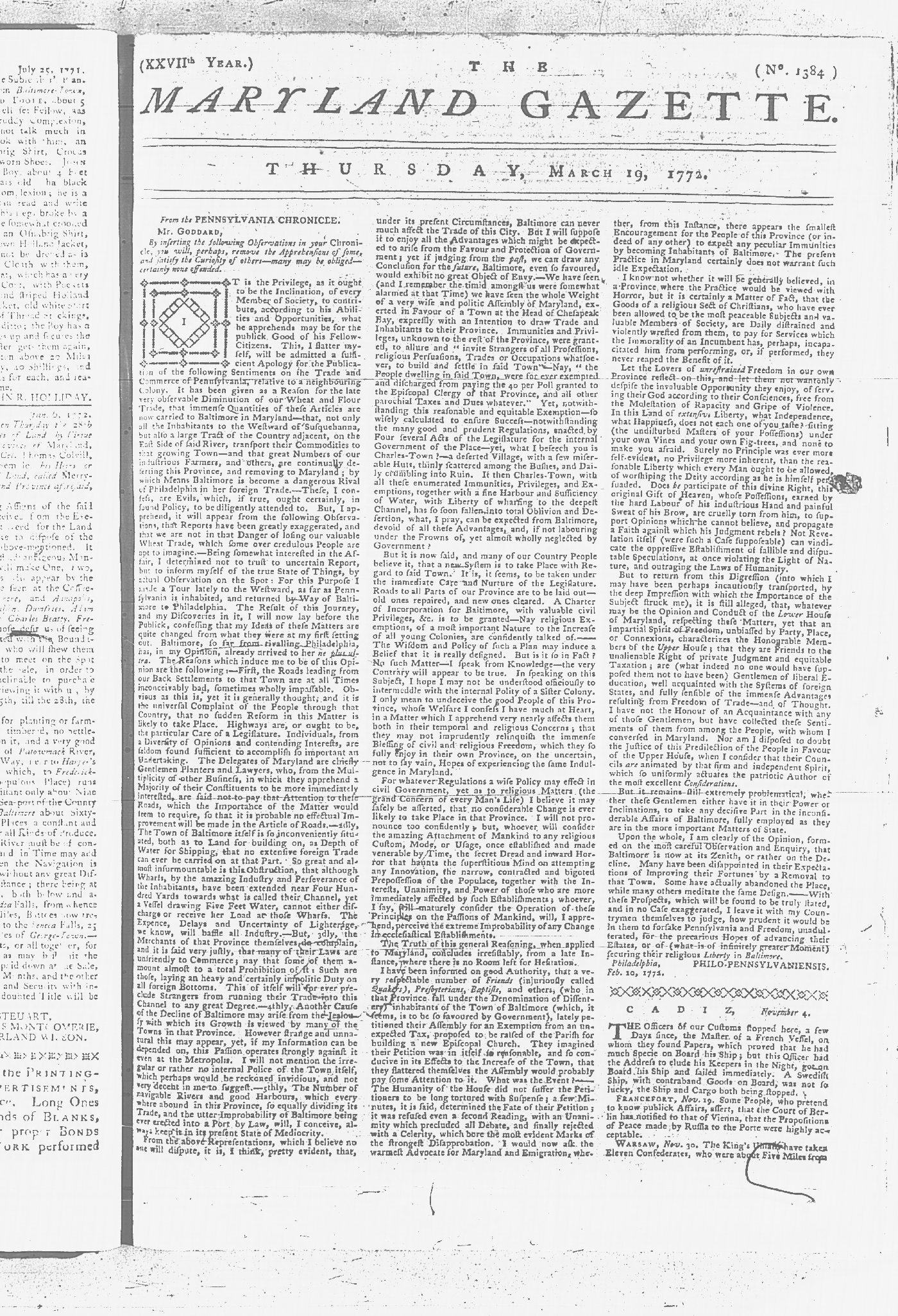 Maryland Gazette Collection MSA SC 2731 January 9, 1772 - September 10, 1779 M 1282 A Publication of the Archives of Maryland Online Image 64 Enlarge and print image (3M) |