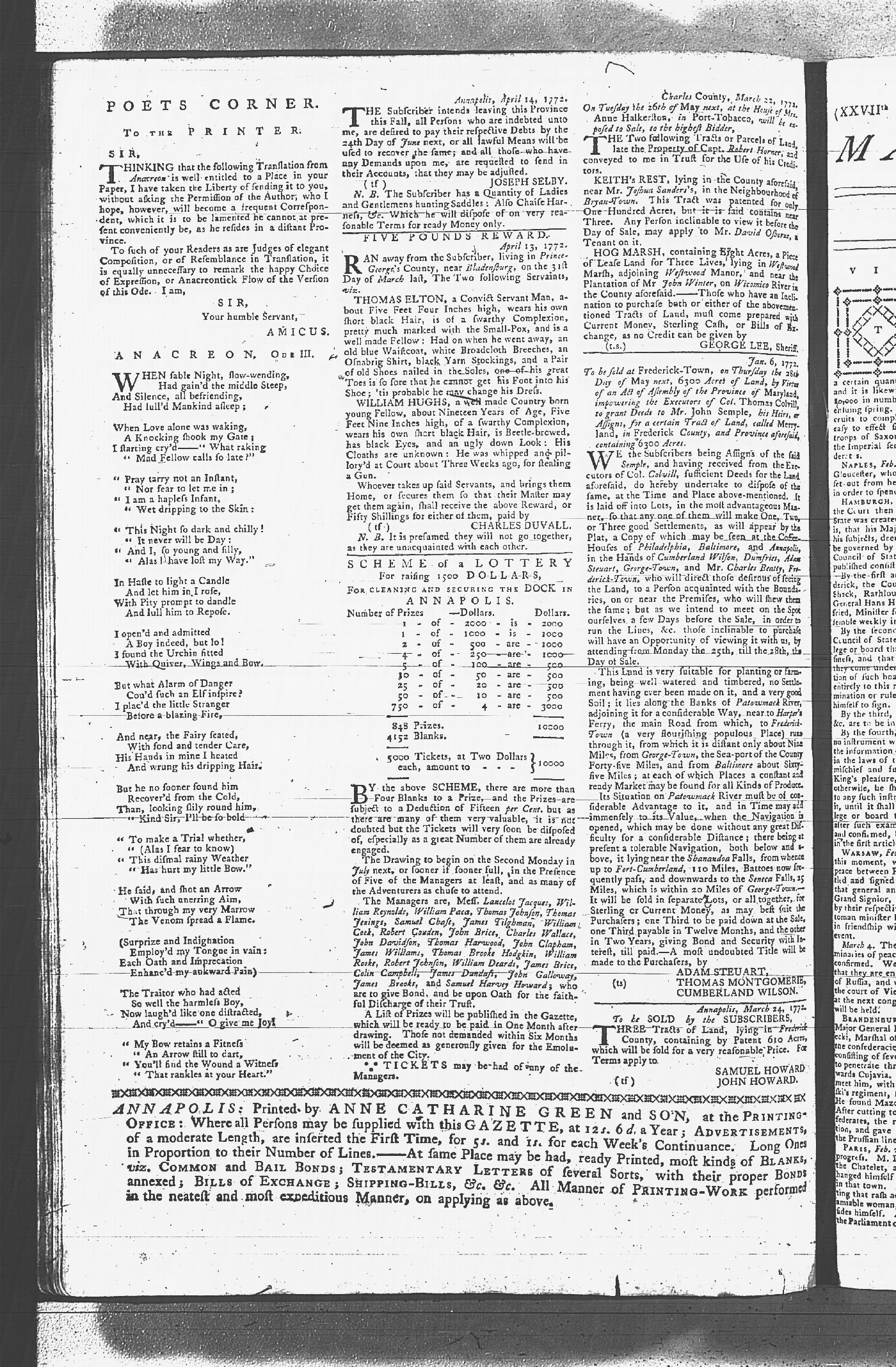 Maryland Gazette Collection MSA SC 2731 January 9, 1772 - September 10, 1779 M 1282 A Publication of the Archives of Maryland Online Image 117 Enlarge and print image (3M) |