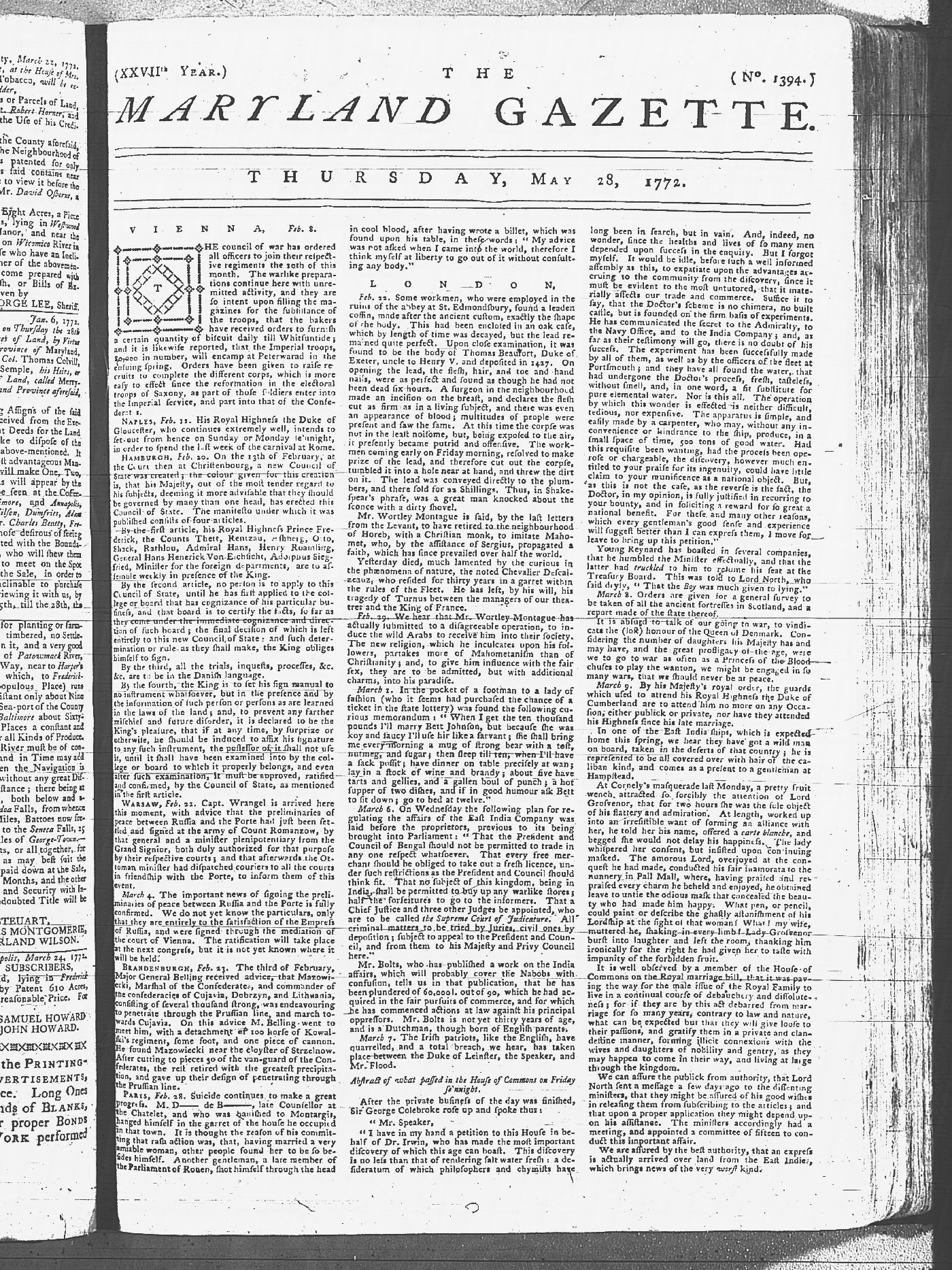 Maryland Gazette Collection MSA SC 2731 January 9, 1772 - September 10, 1779 M 1282 A Publication of the Archives of Maryland Online Image 118 Enlarge and print image (4M) |