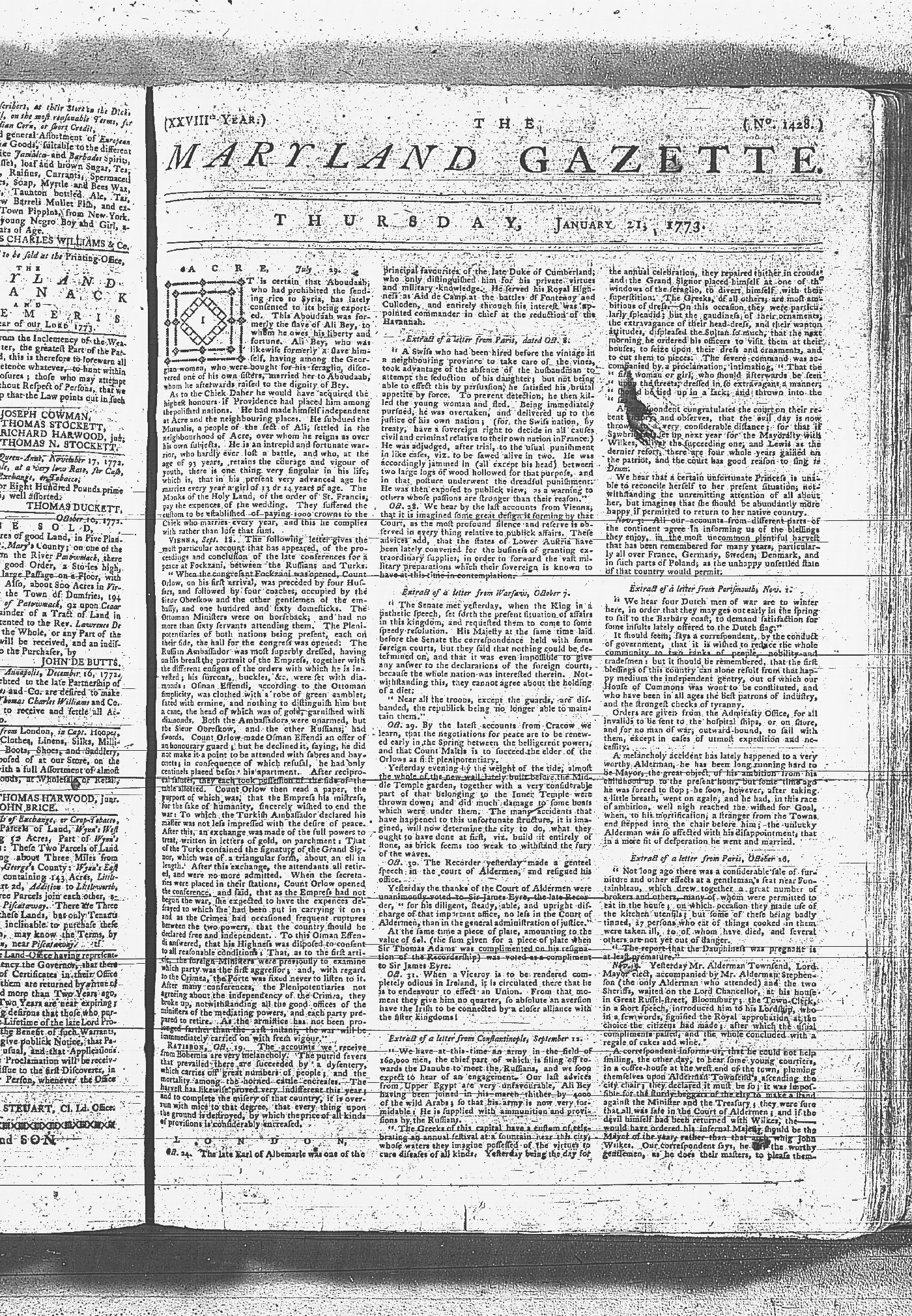 Maryland Gazette Collection MSA SC 2731 January 9, 1772 - September 10, 1779 M 1282 A Publication of the Archives of Maryland Online Image 272 Enlarge and print image (7M) |