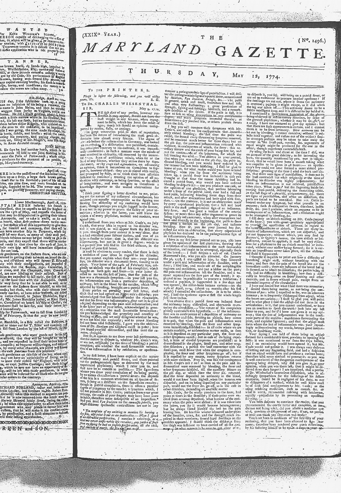 Maryland Gazette Collection MSA SC 2731 January 9, 1772 - September 10, 1779 M 1282 A Publication of the Archives of Maryland Online Image 600 Enlarge and print image (6M) |