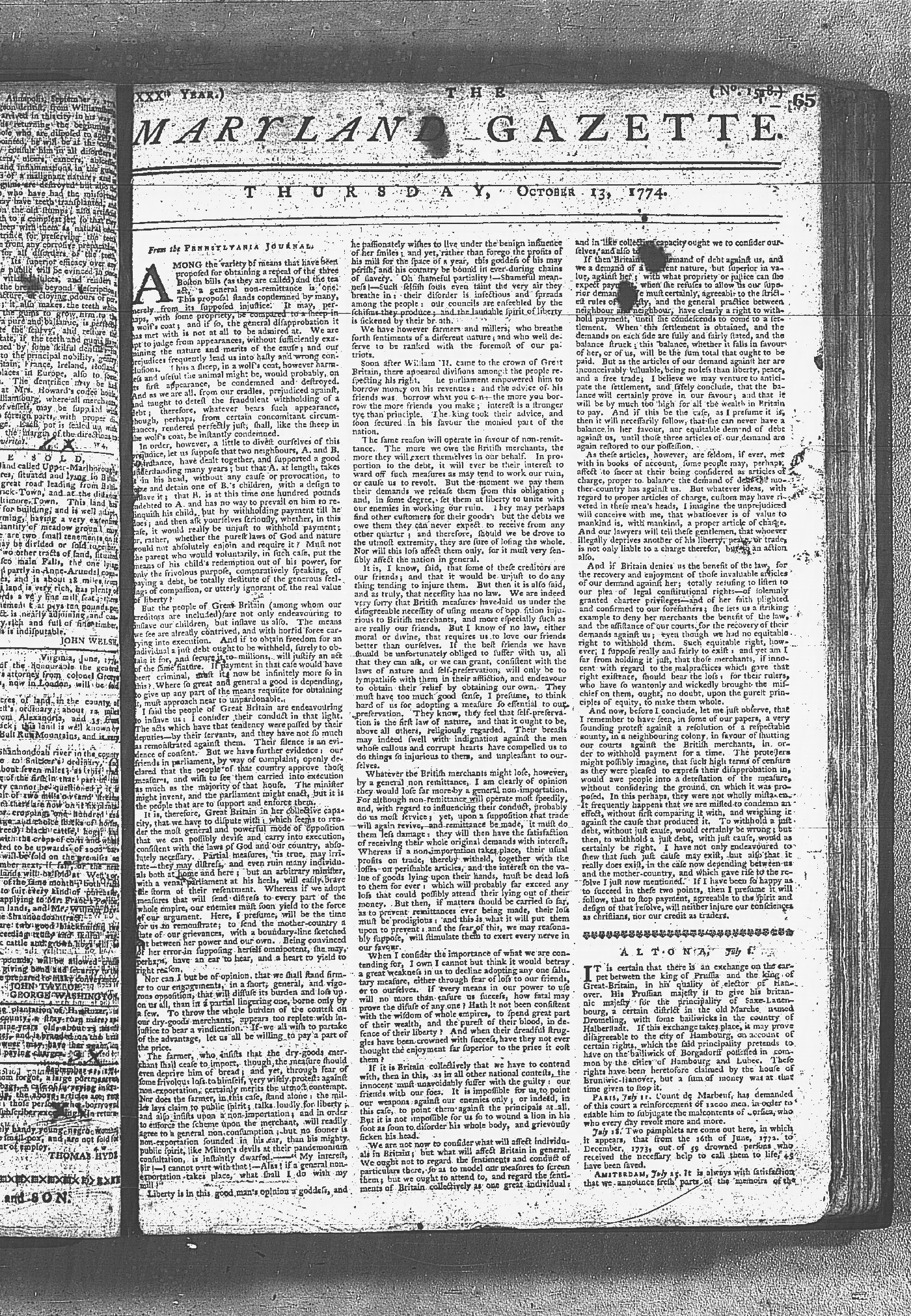 Maryland Gazette Collection MSA SC 2731 January 9, 1772 - September 10, 1779 M 1282 A Publication of the Archives of Maryland Online Image 708 Enlarge and print image (7M) |