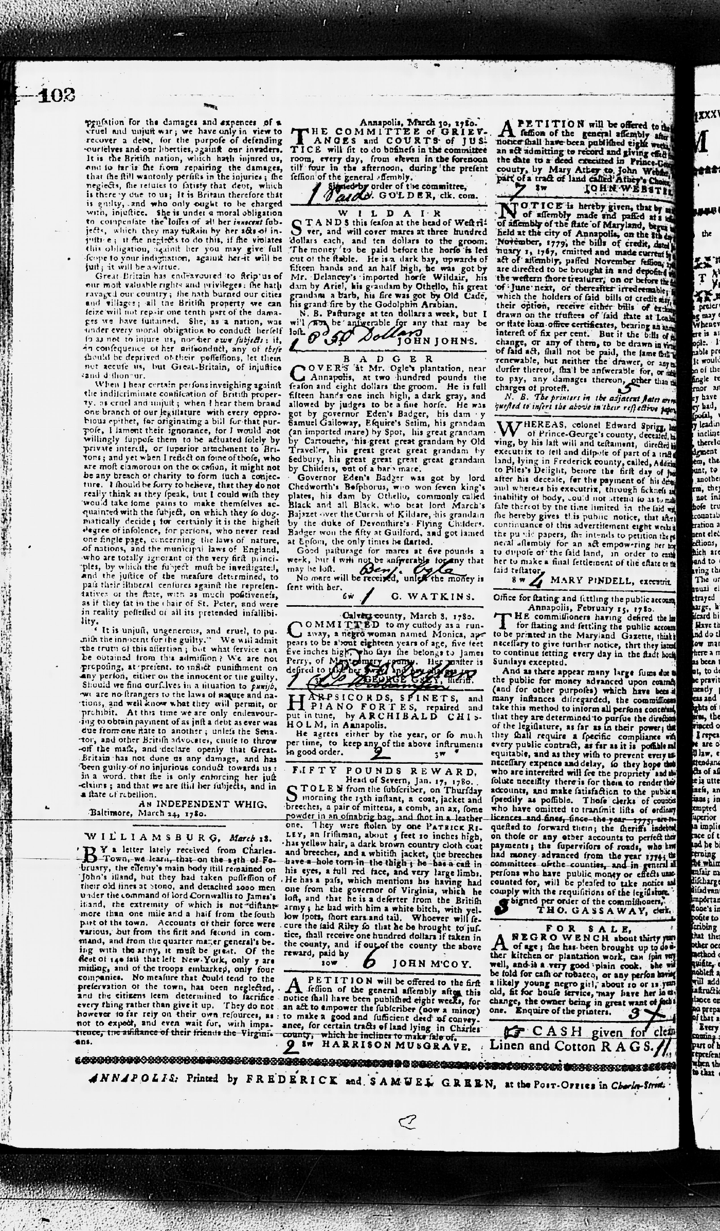 Maryland Gazette Collection MSA SC 2731 September 17, 1779 - June 28, 1787 M 1283 A Publication of the Archives of Maryland Online Image 110 Enlarge and print image (2M) |