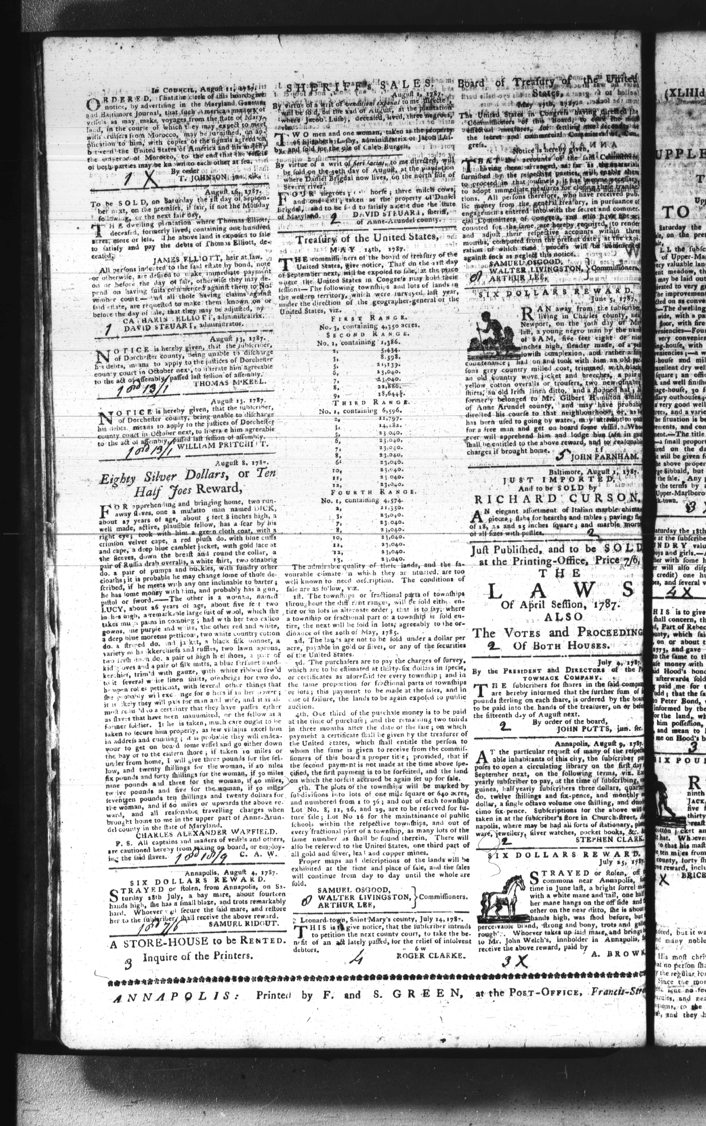 Maryland Gazette Collection (MSA SC 2731) July 5, 1787 - December 25, 1794 M 1284 A Publication of the Archives of Maryland Online Image No: 38 Enlarge and print image (2M) |