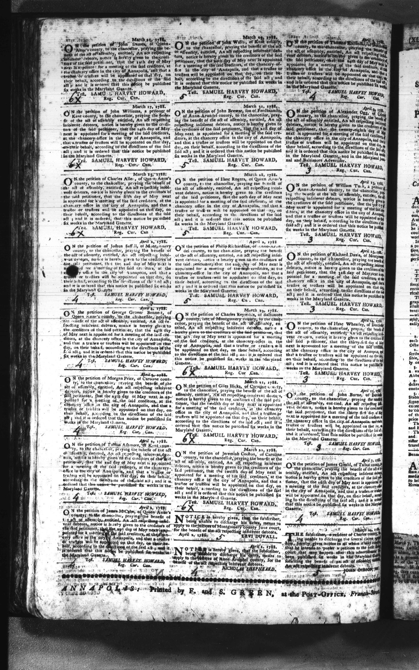 Maryland Gazette Collection (MSA SC 2731) July 5, 1787 - December 25, 1794 M 1284 A Publication of the Archives of Maryland Online Image No: 184 Enlarge and print image (2M) |