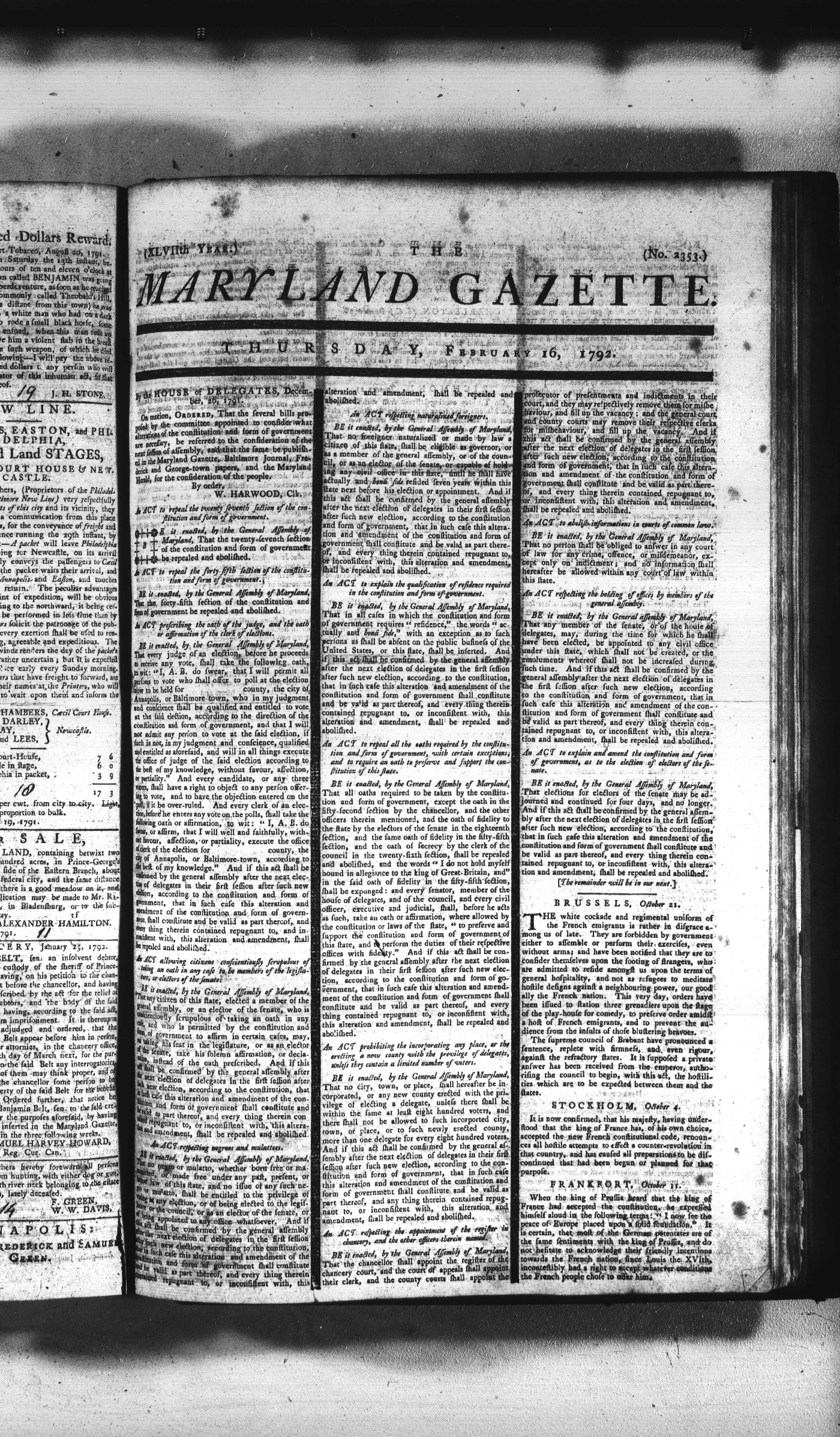 Maryland Gazette Collection (MSA SC 2731) July 5, 1787 - December 25, 1794 M 1284 A Publication of the Archives of Maryland Online Image No: 1051 Enlarge and print image (3M) |